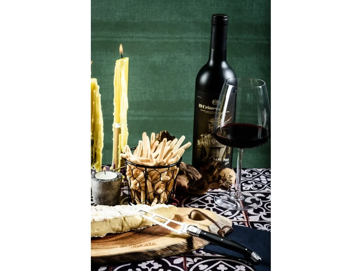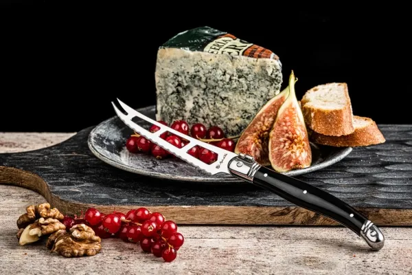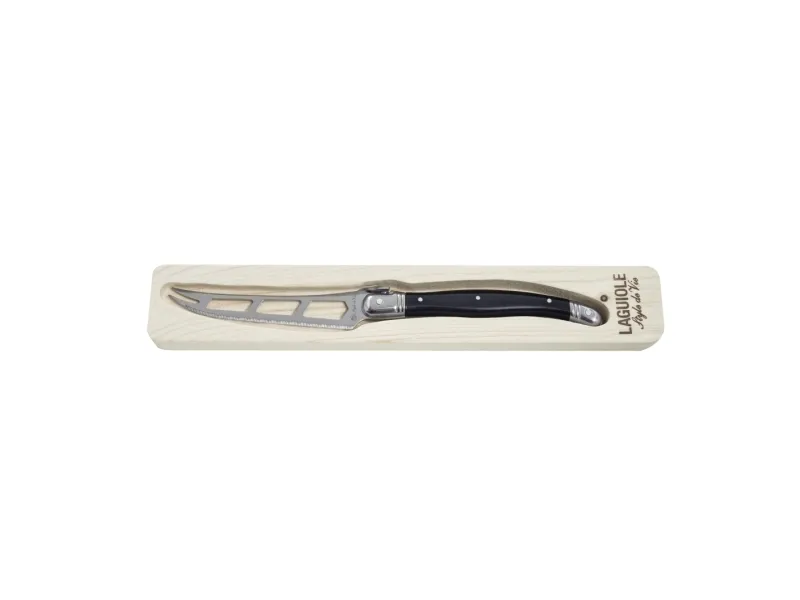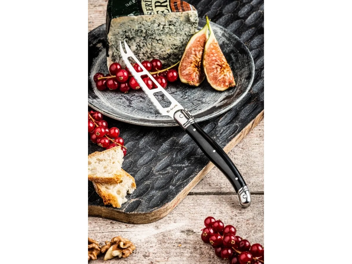 Premium Line Cheese Knife Black of Laguiole Style de Vie har ett öppet blad och en gaffelspets. Hålen i bladet gör att osten lättare kan lossna, vilket gör kniven mycket lämplig för att skära mjukostar. Ett perfekt tillskott till ostbordet! Bladet är 1,2 mm tjockt och kniven tål maskindisk. Förpackad i träbricka.