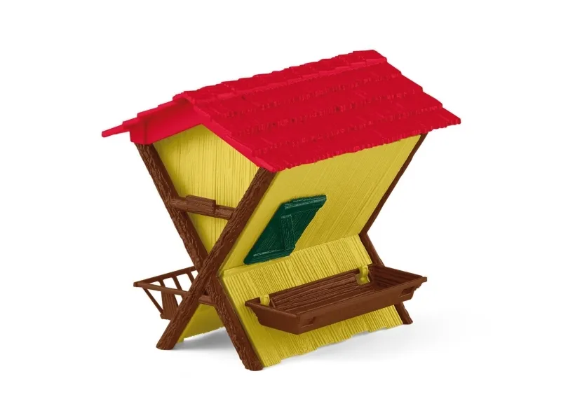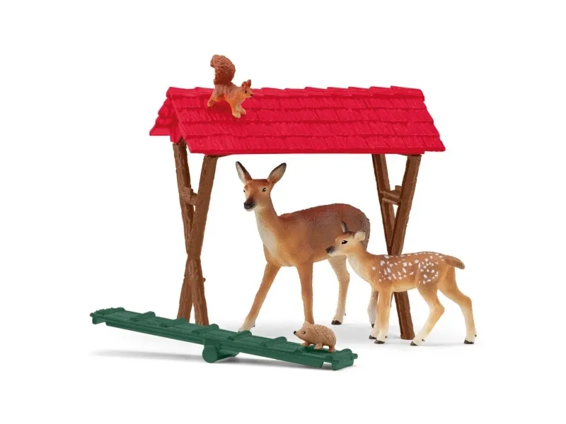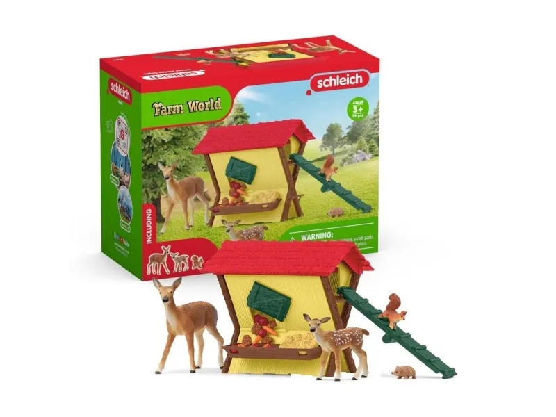 Djuren i skogen är hur nöjda som helst, för de kan alltid hitta något att äta i fodertråget. Där finns något för alla: kronhjortshinden och hennes kalv är glada över att det finns matpellets, men båda njuter också av knapriga morötter. Den skygga igelkotten kommer också gärna förbi. Ekorren glider nyfiket genom foderluckan in i krubban. Kanske hittar den en nöt? Den har i alla fall hittat ett mysigt gömställe under taket. Där uppe kan den också se skogsbonden komma i sin bil (lekset säljs separat).