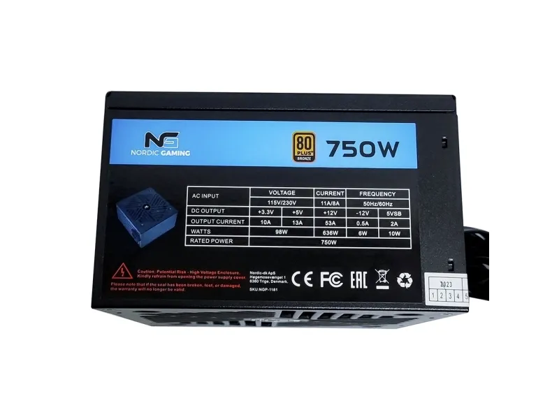 Nordic Gaming NGP-1181 Power supply(internal) - ATX - 80 Plus Bronze - 750W - Semi-modularNordic Gaming NGP-1181. Total power: 750 W, AC input voltage: 115 - 230 V, AC input frequency: 50/60 Hz. Motherboard power connector: 24-pin ATX, Cabling type: Semi-Modular. Purpose: PC, Power supply unit (PSU) form factor: ATX, 80 PLUS certification: 80 PLUS Bronze. Product colour: Black, Cooling type: Active, Fan diameter: 12 cm. Width: 150 mm, Depth: 140 mm, Height: 85 mm