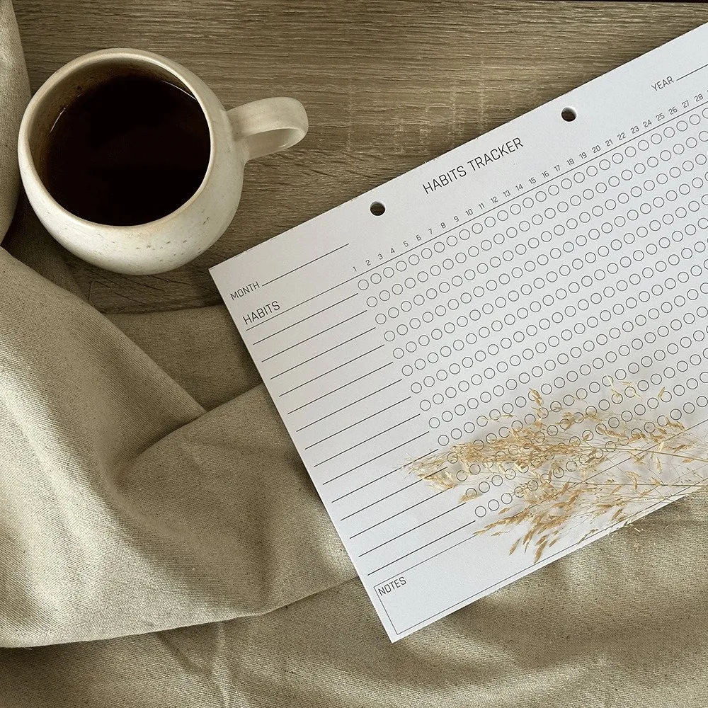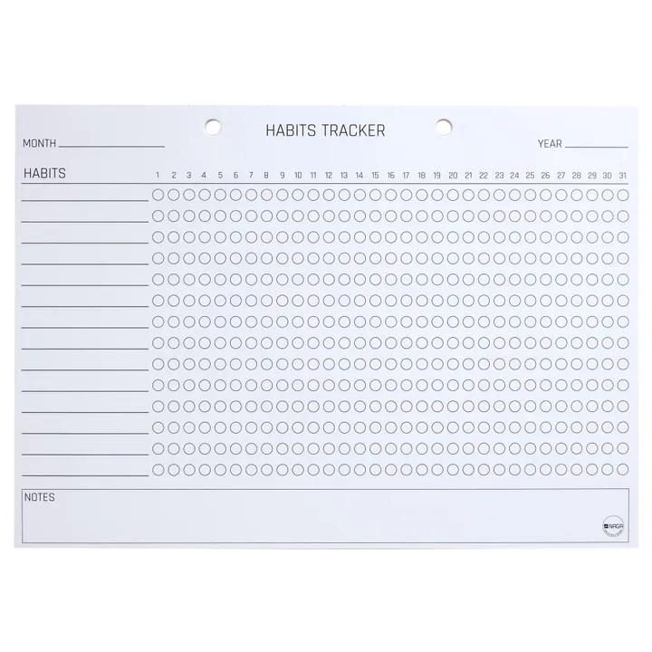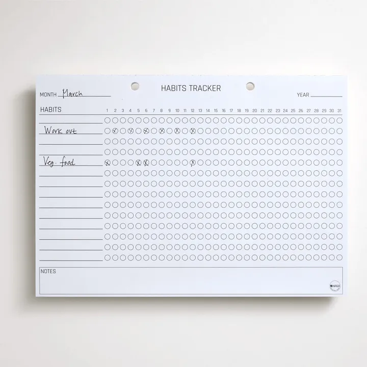 En habit tracker blok kan hjælpe dig til at opbygge nye vaner eller opretholde eksisterende vaner. Du beslutter selv hvilke vaner, du vil fokusere på, inden månedens begyndelse, og skriver dem ind på arket. Hver dag kan du udfylde et felt ud for hver aktivitet, du har gennemført den pågældende dag. Efter en måned har du således et tydeligt overblik over din udvikling. En Habit tracker hjælper dig til at komme tættere på dine overordnede mål.