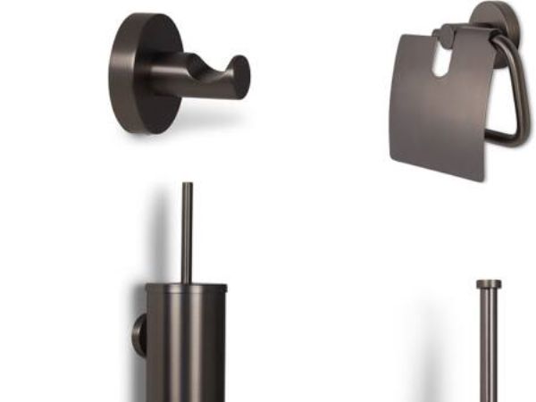 BLUE LABEL badrumsinredning i gun metal - toalettpappershållare, toalettborste, handdukshållare samt reservpappershållare
