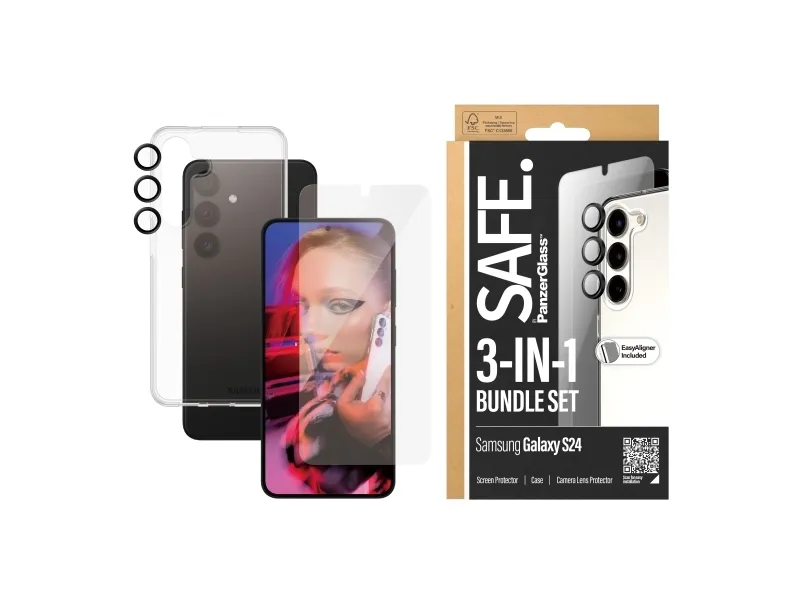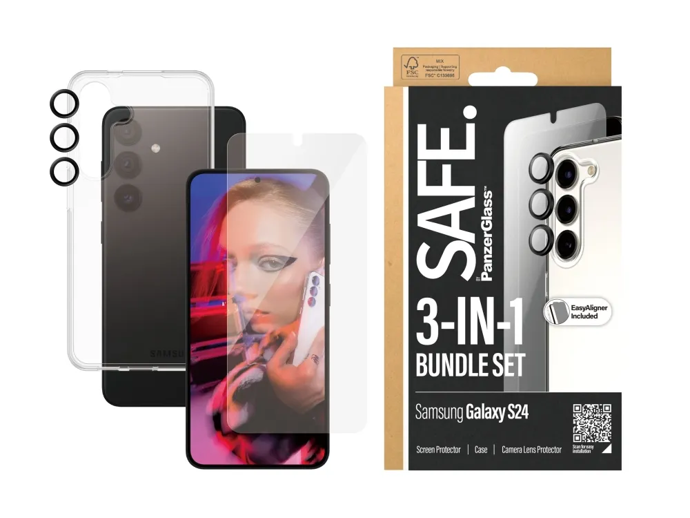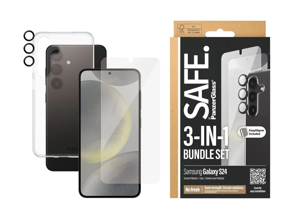 Be free to explore the world, dance through the night and express who you are with your friends in one hand and your phone in the other. With this 3-in-1 protection pack from SAFE. by PanzerGlass ? your precious phone is safe from pocket plunges, dance floor mishaps, selfies gone wrong, and your everyday fumbling, dropping and screen cracking. The pack features a screen protector made of 60% recycled material, a soft TPU case made of 100% recycled plastic and a tougher than tough camera lens protector. It's 360-degree protection for a 360-degree life!No screen protection is worth poor screen performance! That's why the screen protector comes in Ultra-Wide Fit, meaning it covers the front surface of your phone, providing a complete and crystal-clear view of your screen. The soft, transparent case is wireless charging compatible (of course!) and shields your phone effectively while giving you full access to all its functions. No compromise there either! And to top it all off, the camera lens protector keeps your high-tech camera lenses SAFE. and READY to capture the beautiful moments in life in beautiful scratch-free photos.Can you feel it? Love is in the air. Love for phones and the planet. It's the new circle of phone life. When you keep your beloved phone SAFE., you can one day pass it on to another phone lover who will love it just as much as you do. Choose SAFE. and give your phone a second, third or fourth life! This is one way of working toward a more sustainable future! Another is to use more sustainable packaging: This protection pack comes in a box made of recyclable FSC-certified paper.Everybody deserves to be SAFE. Without hassle, red tape, or unnecessary complexity. This protection pack is so easy to install that you can do it even if you're all thumbs! Start by applying the screen protection – you have up to 200 tries, although one is usually enough. And when you're done, apply the camera lens protector and click on the case. That's it!Now you'll never again fear the sight of your phone tumbling to the ground. This may not happen, but if it does, you'll regret not having clicked "add to cart".Keep your phone SAFE.