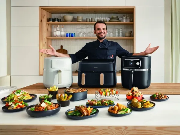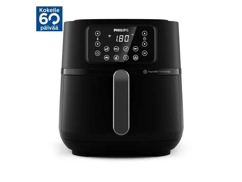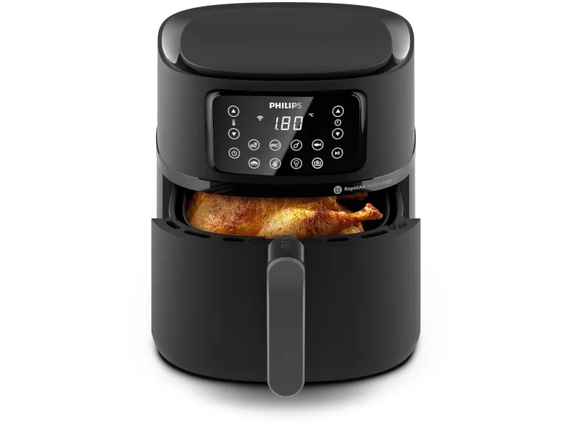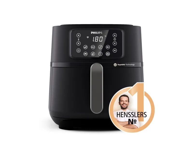 Philips Series 5000 Connected HD9285 XXL varmluftsfritös kombinerar innovativ teknik och användarvänliga funktioner. Med en matkapacitet på 1,4 kg och en generös volym på 7,2 liter kan denna fritös hantera större måltider samtidigt som den använder Rapid Air-teknik för hälsosammare matlagning. Den smarta designen inkluderar en digital display och beröringskänsliga reglage, vilket gör det enkelt att hantera inställningarna, inklusive en timer på upp till 60 minuter. Kompatibilitet med Alexa och smarttelefoner gör att matlagningen kan hanteras på distans för extra bekvämlighet.