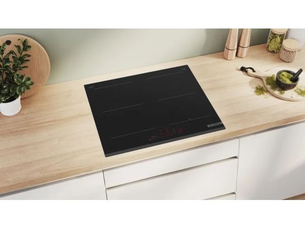Smart connectivity through Wi-Fi enables users to control and monitor their cooking remotely, adding a layer of convenience to daily tasks. Safety is a priority with features like a child security lock, quick stop main switch, and a 2-stage residual heat indicator, making it a safe choice for families. The cooktop's sleek, frameless design with a durable ceramic surface not only enhances the kitchen's aesthetic but also makes cleaning effortless. Choose the Bosch Serie | 6 PVQ631HC1E for a modern, efficient, and safe cooking solution.