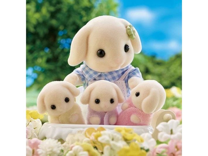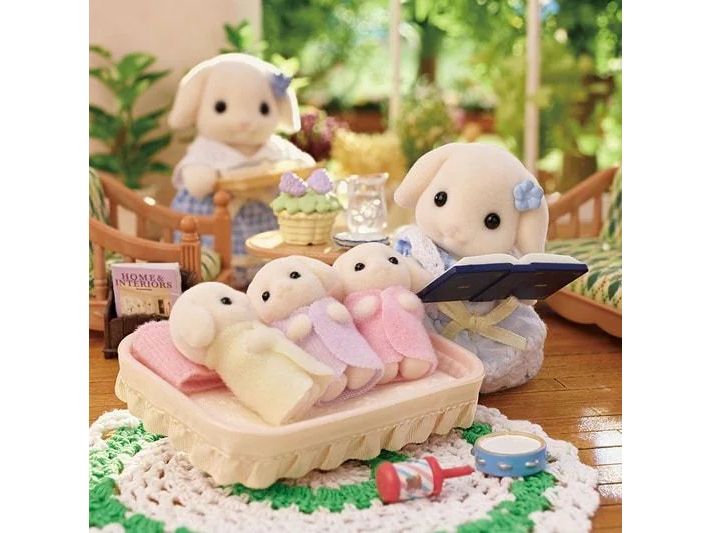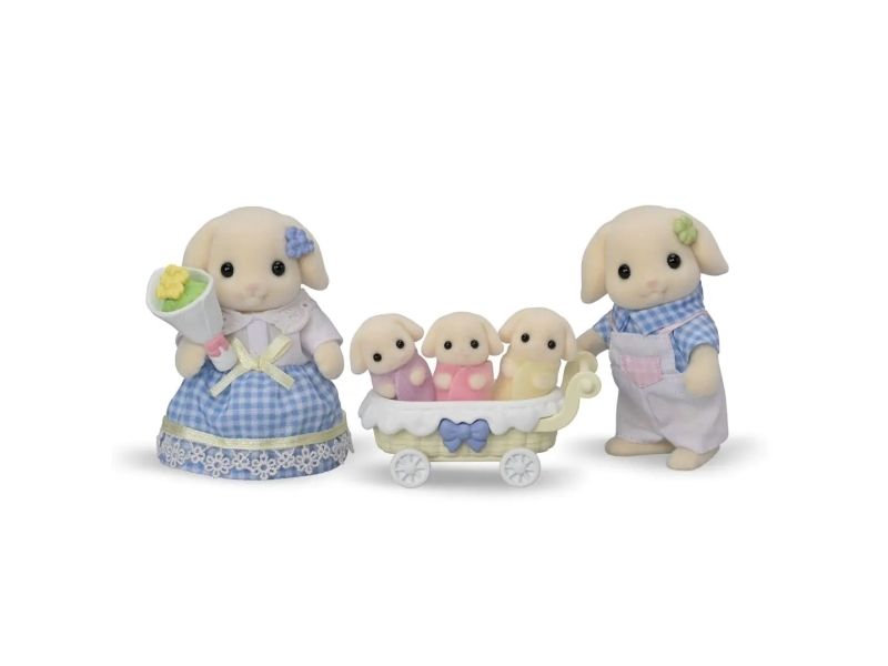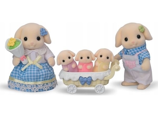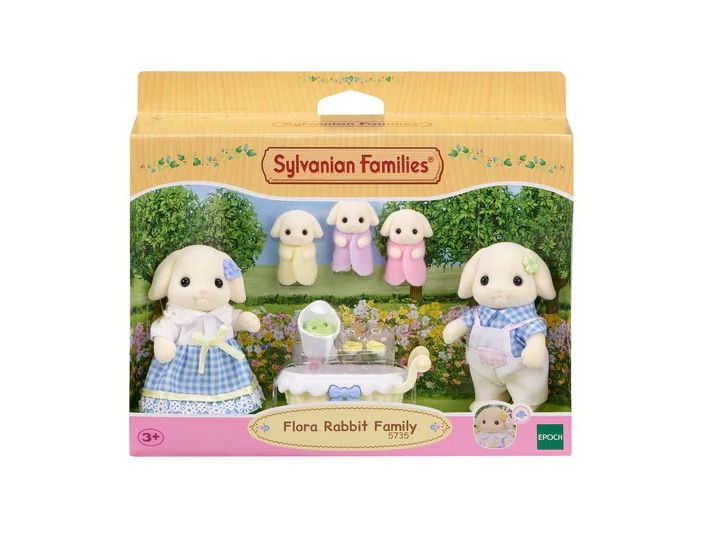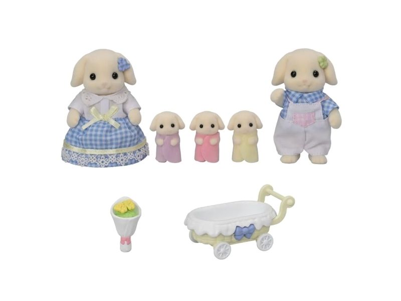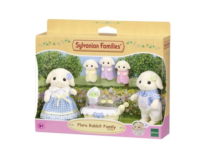 Familjen Florakanin har bedårande hängande öron och de älskar blommor. Setet innehåller pappan, mamman, tre vaggade barn och en mängd olika tillbehör. Blomman och klövern på figurernas öron kan bytas ut mot blommorna i buketten. Du kan lägga de tre barnen i barnvagnen. Figurers huvud, ben och armar är rörbara. Kläderna kan tas av och sätts pä igen. Stimulerar fantasifullt rollspel för barn. Kombinera med andra Sylvanian leksaker. Lämplig för åldrarna 3+. set med 5 medlemmar;föräldrar och trillingar;barnvagn och annat tillbehör;armar och huvud rörbara;kläderna avtagbara;kombinera med andra Sylvanian leksaker;passar för åldrar 3+;