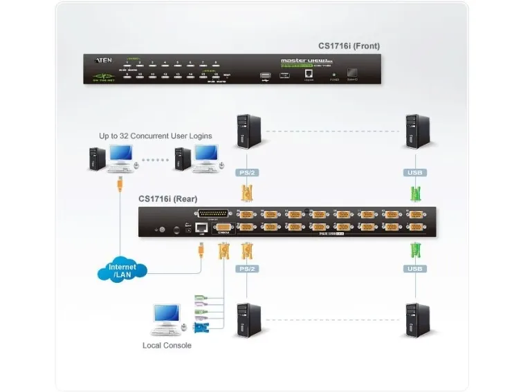 CS1716i är en KVM-switch med 16 portar i ett 1U-hölje för smidig rackmontering. Den här enheten ger systemadministratörer åtkomst till servrar lokalt och över IP (LAN och/eller WAN). CS1716i fungerar oavsett operativsystem och stödjer t.ex. Windows, Linux, MAC, SUN