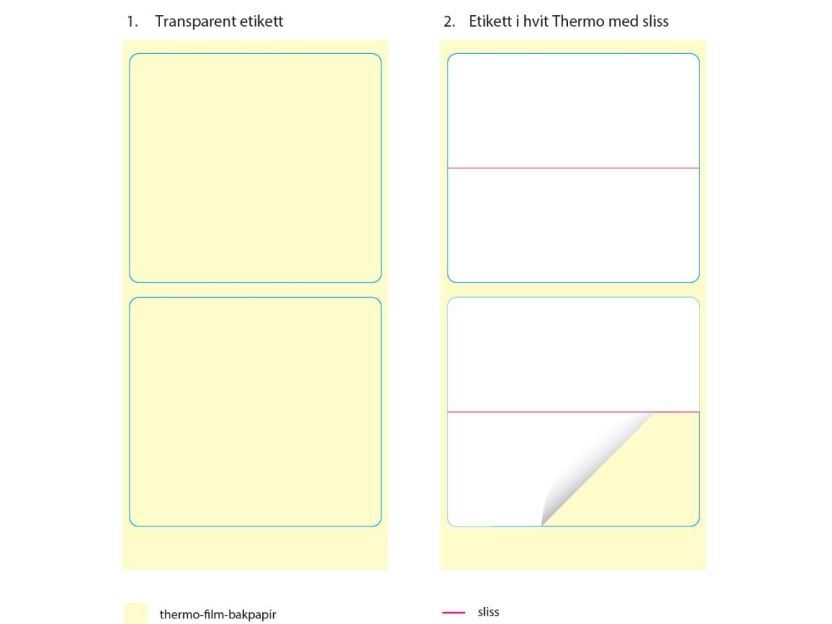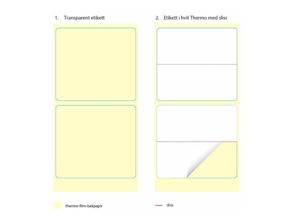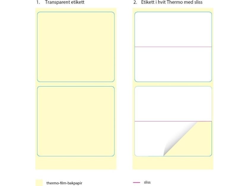 This multi-layer label is constructed with a white thermal layer on top and a transparent plastic layer underneath. The whole multi-layer label is 55x50mm. only the thermal layer is divided into 2 labels of 55x25mm. each.