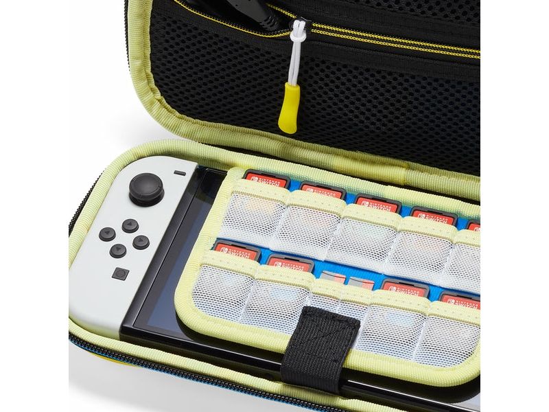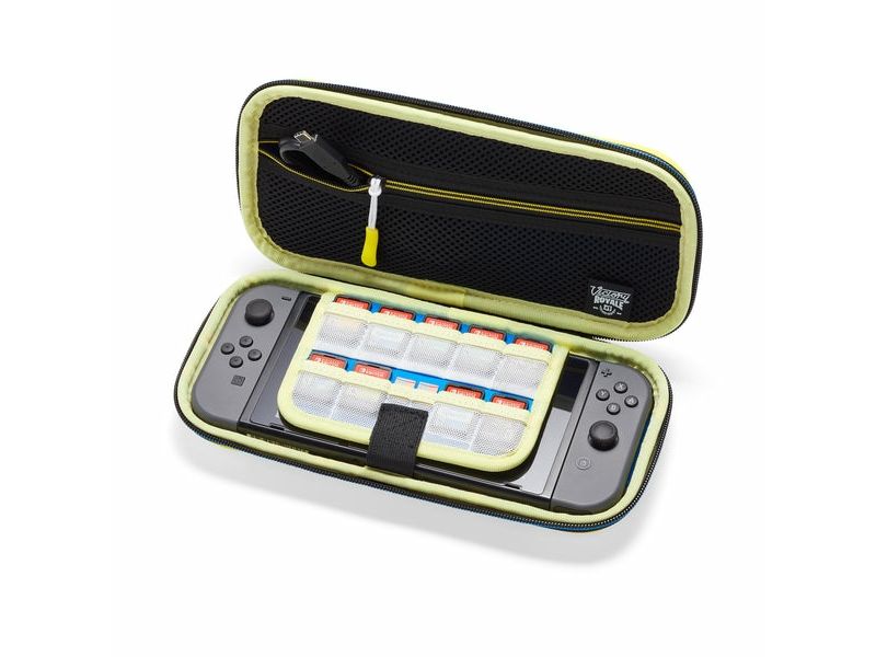 Fodralet är utrustat med ett gummerat bärhandtag som gör det lätt att transportera. Den har ett inbyggt konsolställ för bekvämt spelande och en invändig nätficka med dragkedja som ger plats för tillbehör. Det finns en särskild förvaring för 9 spelkort, så att de hålls organiserade och inom räckhåll. Med dubbla blixtlås för enkel åtkomst är detta fodral en idealisk lösning för spelare på språng.