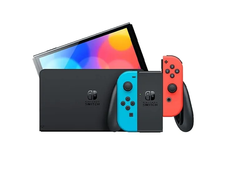 Nintendo Switch (OLED-modell) har en 7-tums OLED-skärm med levande färger och hög kontrast. Konsolen har ett brett justerbart stativ för bordsläget, en docka med en fast LAN-port för stabilt onlinespel, 64 GB internt lagringsutrymme och inbyggda högtalare med förbättrat ljud för spel i handhållet och bordsläge.