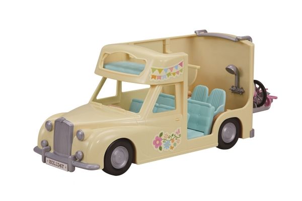 Nu bär det iväg på semester med Sylvanian Families husbil. Hela familjen ser redan fram emot semestern. Husbilen har plats för 7 figurer (2 vuxna, 2 barn, 1 bebis och tvillingarna). Sätena kan placeras individuellt i bilen och snabbt förvandlas till sängar som hela familjen kan sova bekvämt på. I husbilens bakre del finns det en toalett och en dusch. Man kan leka med köksdelen inne i bilen eller utanför. Även en cykel kan tas med på semestern. Cykelhållaren sätts fast bak på husbilen. På cykelhållaren är i sin tur cykeln och metspöt fastsatta. Med fiskeredskapet fångar Sylvanians goda fiskar, som de tillreder vid husbilen. I leksetet Sylvanian Families ingår den ca 29 cm stora bilen med badrum och säten, köksbänk, bord, cykelhållare, cykel, sparkcykel, metspö, hink, kikare och många andra tillbehör. Passar barn från 3 år.