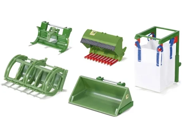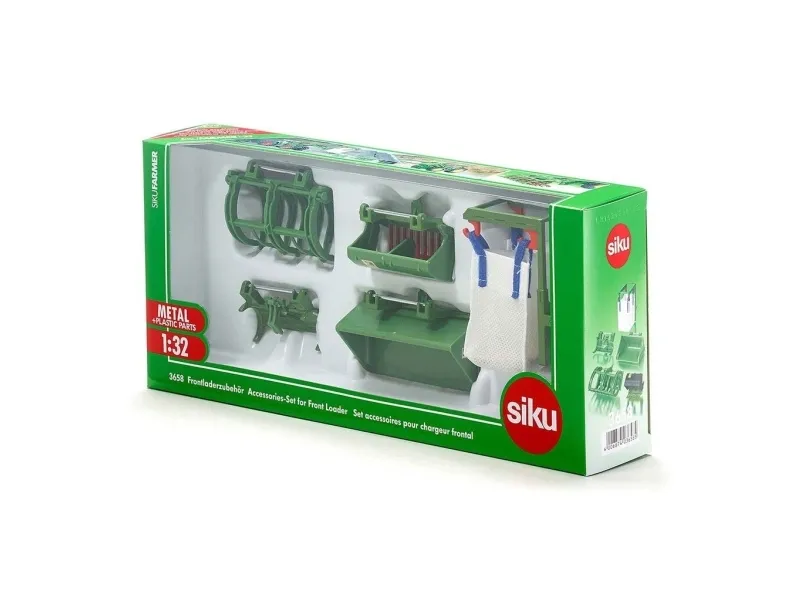 5-piece accessory set, Contains dumping shovel, brushwood fork, logging grab, silage cutter and big pack + carrier, Ideal for all front-loader siku tractors at a 1:32 scale - Simple fastening via front loader attachment system, Quickly change from one accessory to the next. Realistic look and operation based on authentic farming equipment. Fully functional accessories made of plastic with metal parts. Scale: 1:32, Material: Metal/Plastic.
