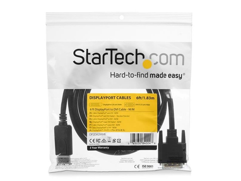 DP2DVI2MM6 1,8 m lång DisplayPort till DVI-adapterkabel gör att du kan ansluta en DVI-display eller -projektor till en DisplayPort-videokort/-källa. Ger ett anslutningsavstånd på 1,8 m. Kabeln har DVI- och DisplayPort-hankontakter, vilket gör att du kan göra en direktanslutning mellan videokort och skärm, istället för att behöva använda en adapter med separat kabel.