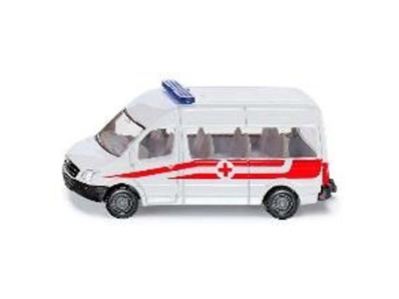 Detailed toy model of an ambulance with inscription "112 Rettungsdienst" for play and collecting. Robust and stable metal frame, Excellent mobility thanks to plastic tyres. Perfect addition to other siku products. Material: metal/plastic, Dimensions: 8.2 x 3 x 3.6 cm.