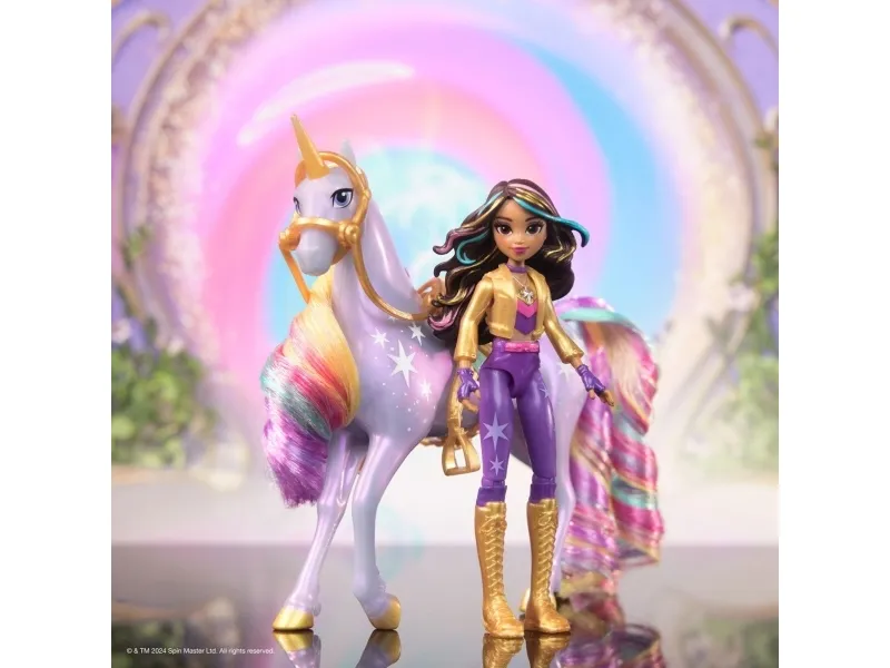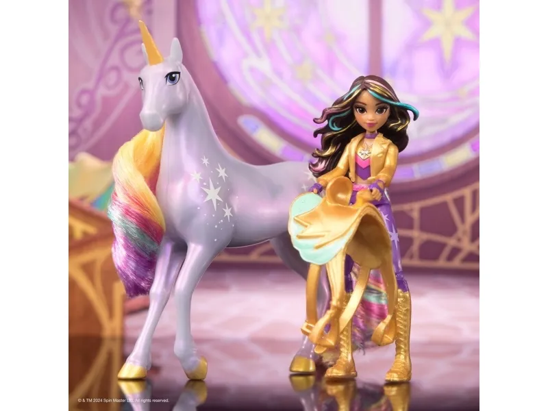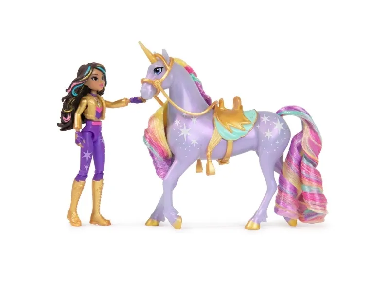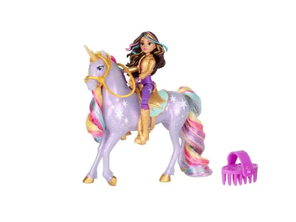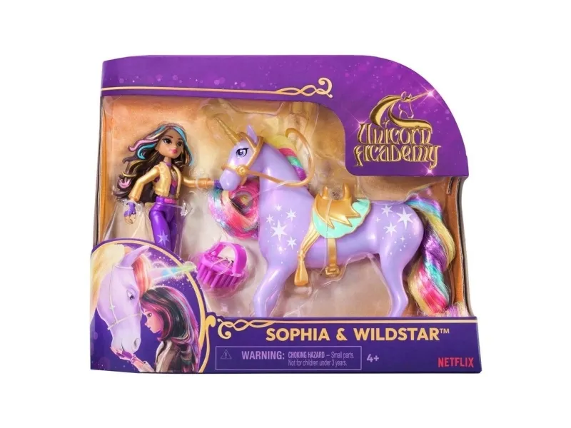Sophia & Wildstar-leksetet från Unicorn Academy är en hyllning till det starka bandet mellan ryttare och enhörning. Sophia (11,4 cm) har 7 rörliga leder och verklighetstrogna detaljer från serien. Wildstar (12,7 cm) matchar Sophia med ljusmagimärken och regnbågsfärgad man och svans som kan borstas (borste medföljer). Med det avtagbara tränset och sadeln sitter Sophia lätt på Wildstar medan de rider ut på nya äventyr. Figurerna från Unicorn Academy får liv inspirerade av den animerade NETFLIX-serien och de bästsäljande böckerna där vänskapen regerar. Utvidga din värld med modedockor, enhörningar eller de små dockorna och lekseten från Unicorn Academy (säljs separat). Unicorn Academy-leksakerna är den perfekta presenten för alla tillfällen till barn som älskar enhörningar, hästleksaker, dockor och tillbehör, dockskåp, samlarobjekt, gosedjur och liknande. Upplev förtrollande Unicorn Academy-äventyr med Sophia & Wildstar.