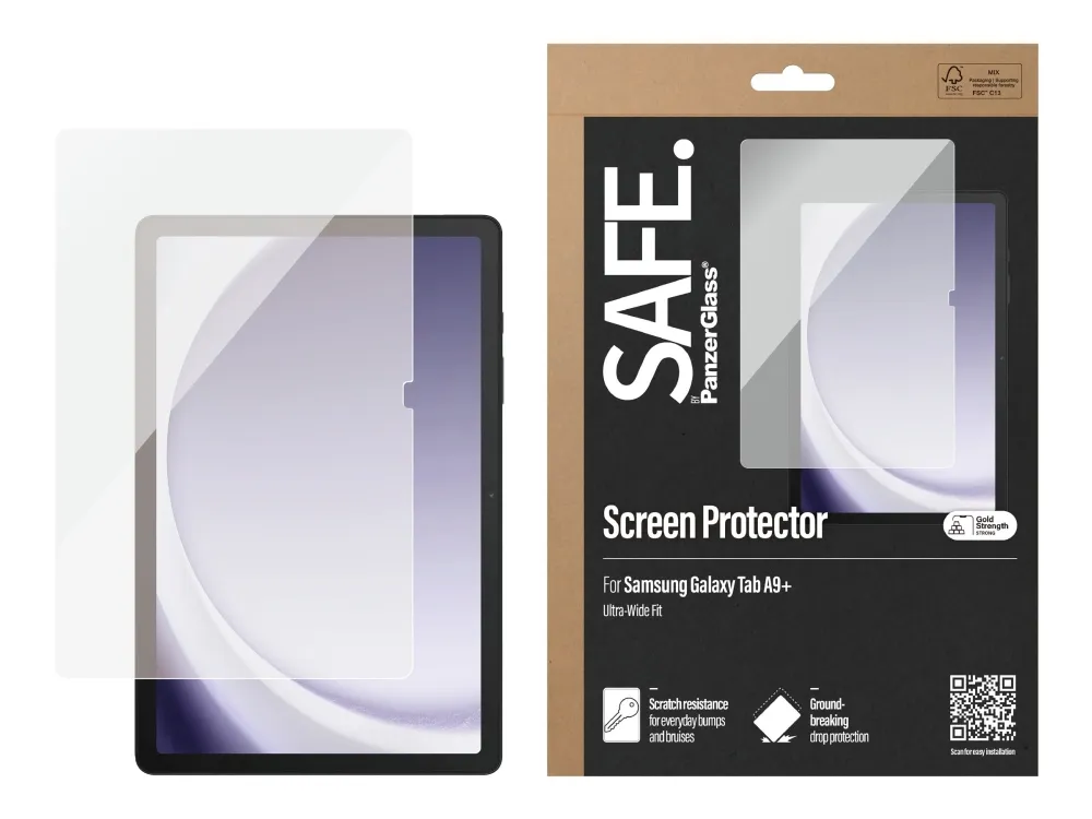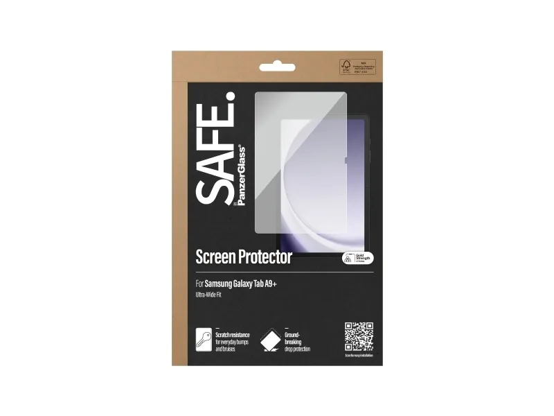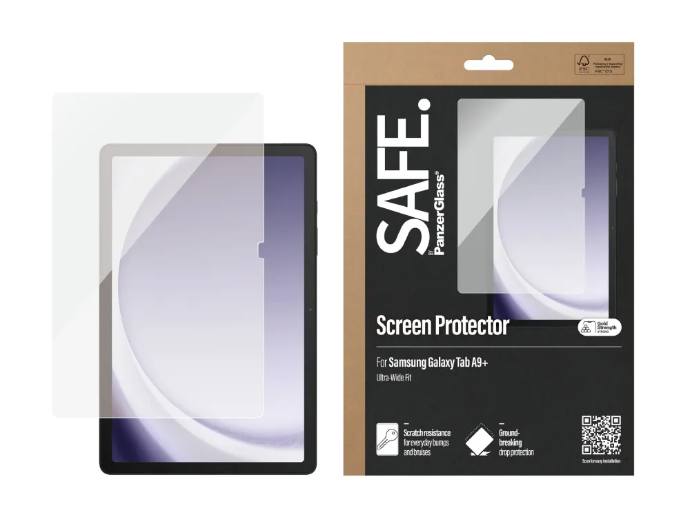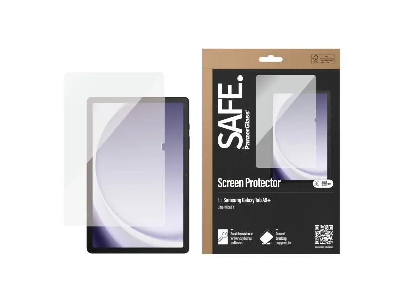 The Ultra-Wide Fit screen protector covers the entire front surface of your tablet, while still leaving room for a case, and provides a complete and crystal-clear view of your screen.PanzerGlass SAFE. by ® Screen Protector Samsung Galaxy Tab A9 Plus | Ultra-Wide Fit. Material: Tempered glass, Polyethylene terephthalate (PET), Brand compatibility: Samsung, Compatibility: Samsung - Galaxy Tab S9+. Weight: 49 g. Quantity per pack: 1 pc(s)