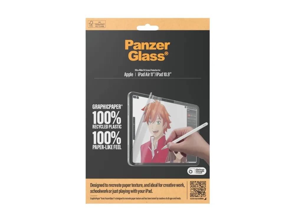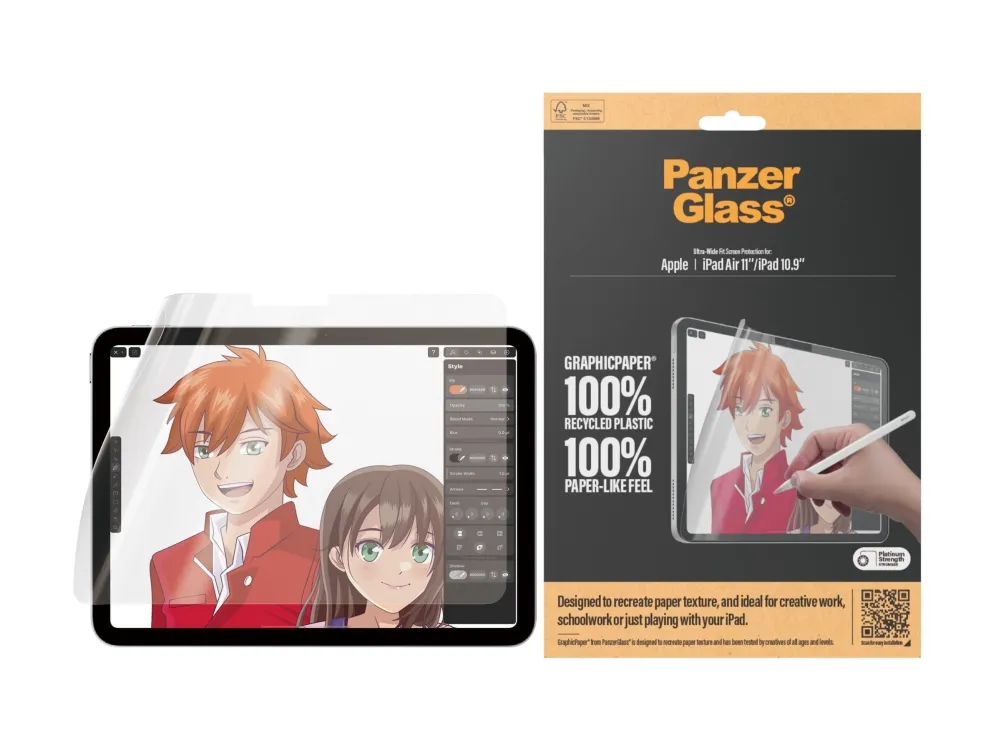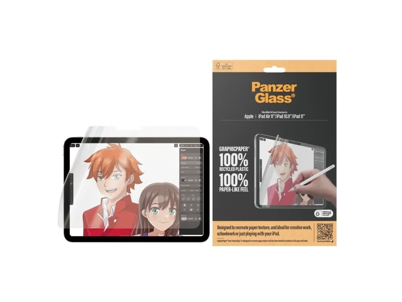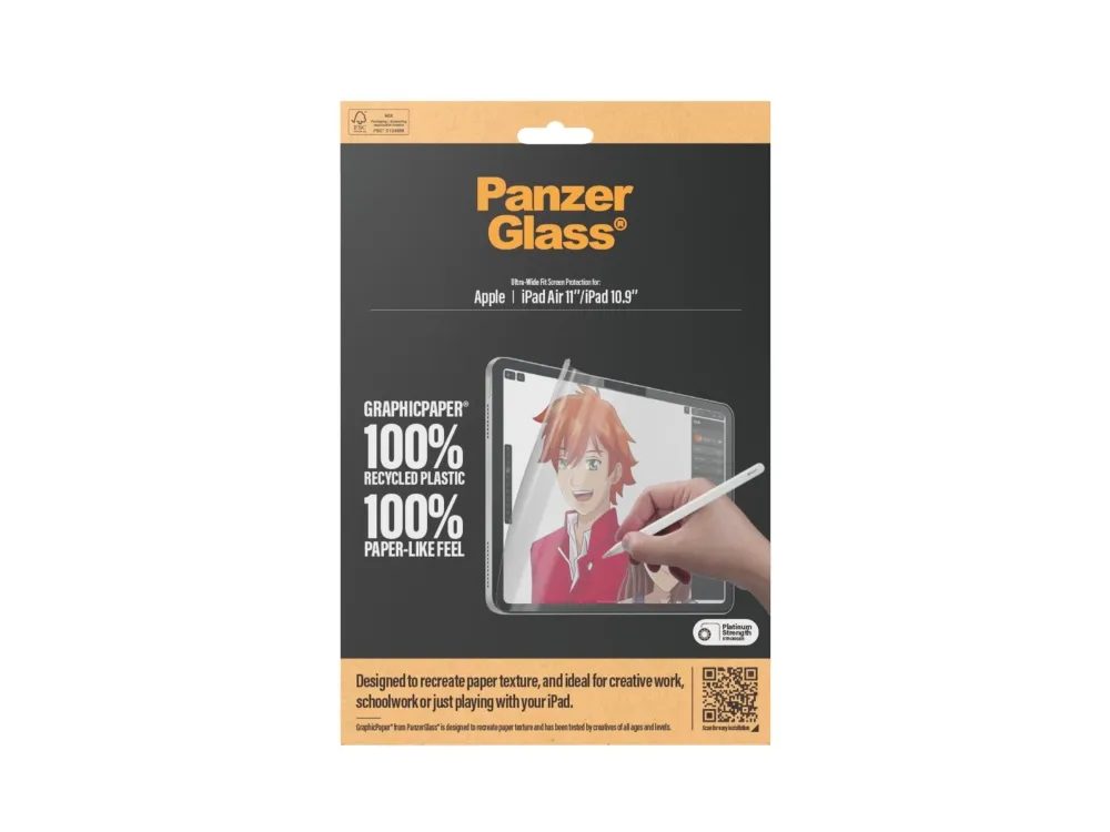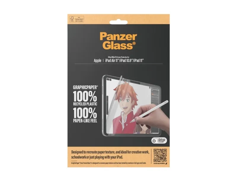 Introducing our updated award-winning GraphicPaper screen protector, now with 100% recycled plastic. It is designed to recreate the texture of paper while also protecting your tablet from the hazards of everyday life. Tested by creatives of all ages and levels, it is ideal for creative work, school work, note-taking, sketching, drawing, or simply playing games. The screen protector is scratch and shock-resistant and even features a smudge-free coating. The Ultra-Wide Fit screen protector covers the entire front surface of your tablet while still leaving room for a case. It provides a clear view of your screen and comes in FSC-certified packaging that can be recycled.