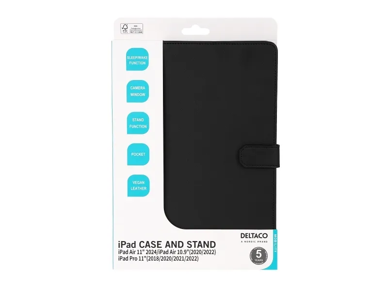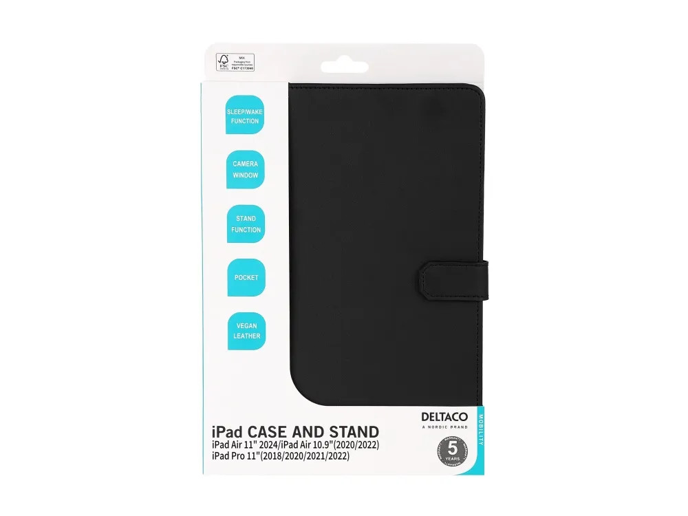 DELTACO - Skydd för surfplatta - konstläder, PU-läder (termoplastisk polyuretan + polykarbonat) - svart - för Apple 10.9-inch iPad Air (4th generation, 5th generation); 11-inch iPad Air (M2, M3); 11-inch iPad Pro (2nd generation, 3rd generation, 4th generation)
