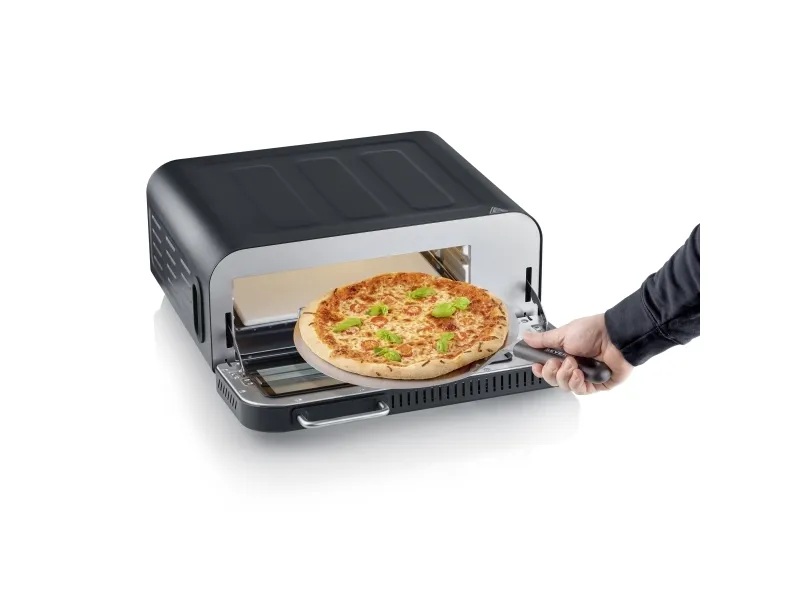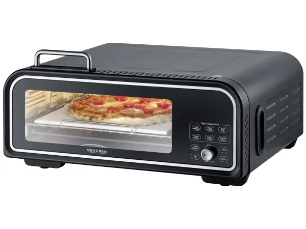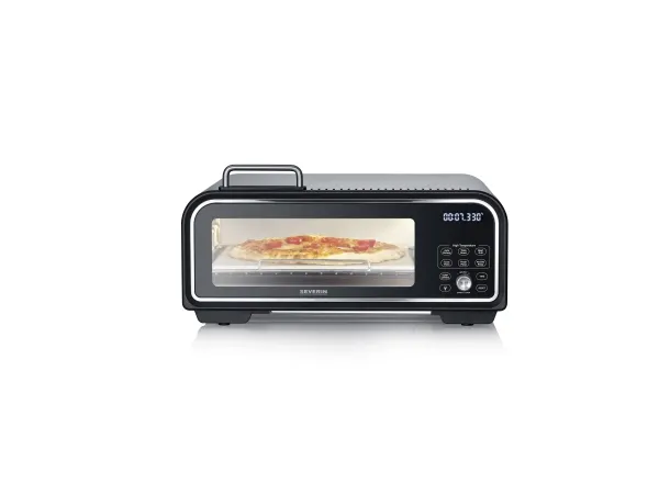 Nyckelord: SEVERINS elektrisk pizzaugn, 400°C, 5 minuter, digital display, pizzasten, gjutjärnsplatta, varmluftsfunktion, tre-skiktat glas.