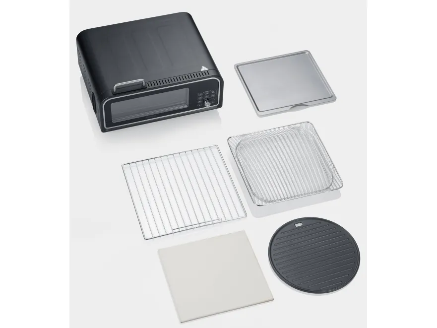 Men det stopper inte där. Pizzaugnen har även en varmluftsfunktion som gör att du kan tillaga krispiga pommesfrites i den. Tack vare det tre-skiktade glaset i dörrluckan stannar all värme effektivt inne i ugnen under användning.