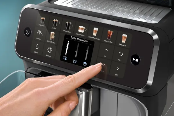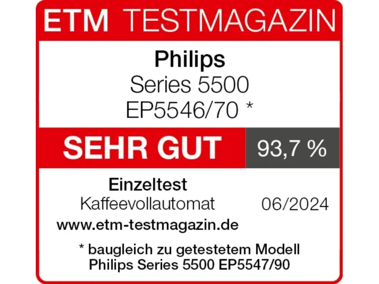 Brand- Philips. Model- EP5546/70. Depth- 43.3 cm. Width- 24.6 cm. Height- 37.1 cm. Weight- 8 kg. Colour- Black. Material housing- Plastic, Stainless steel. Power- 1500 W. Maximum working pressure- 15 Bar. Type of coffee- Ground coffee, Coffee beans. Types of beverages- Café au lait, Black coffee, Coffee with milk, , Latte Macchiato, Ristretto, Cold Brew Coffee, Hot water, Latte, Caffè Crema, Espresso Lungo, Espresso, Cappuccino. Water capacity- 1.8 l. Coffee bean capacity- 275 g. Capacity for milk- Yes. Milk container capacity- 0.26 l. Coffee strength adjustment- Yes. Water hardness adjustment- No. Preparing several cups at once- No. Steam nozzle- No. Cup warming- No. Integrated coffee grinder- Yes. Adjustable coffee coarseness- Yes. Preserving coffee recipes- Yes. With manometer- No. Automatic washing- Yes. Adjustable pressure- No. Automatic descaling- Yes. Automatic cleaning of the milk system- No. Programmable water temperature- No. Water filter- Yes. Programmable coffee quantity- Yes. Automatic shutdown- Yes. Screen- Yes. Type of coffee machine- Automatic. Preparation of cold drinks- Yes. Intelligent preheating- No. Screen type- TFT. Coffee drinks copy and personalization- No. Milk temperature programming- No. Active bean monitoring- Yes. Ground coffee preparation- Yes. Mandatory warranty- 24 mo.