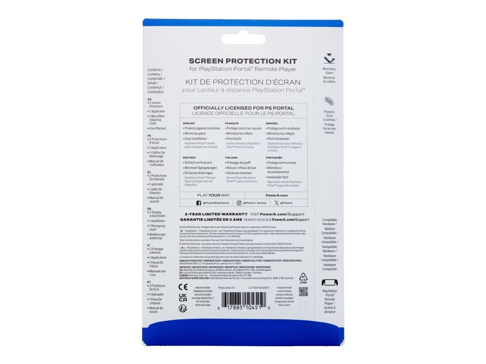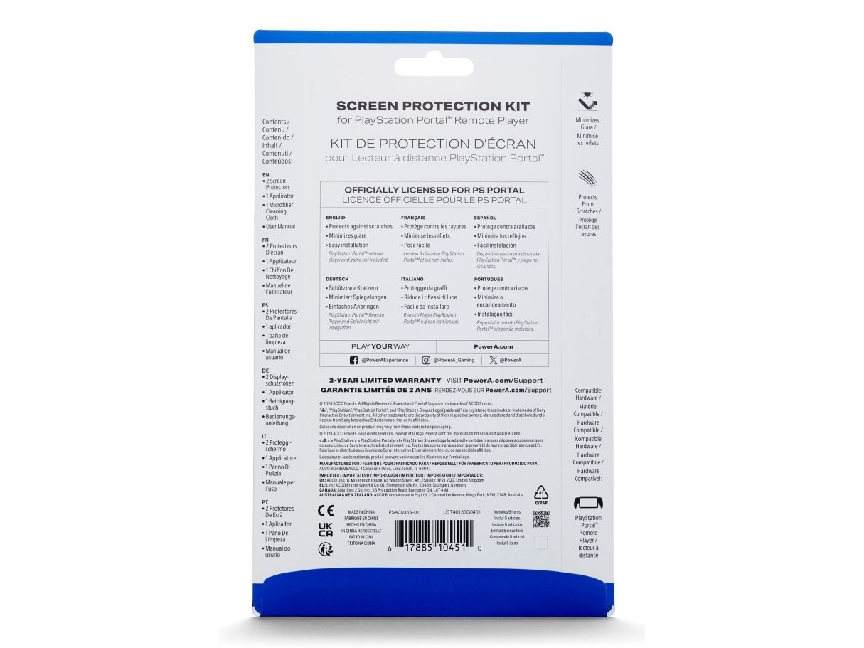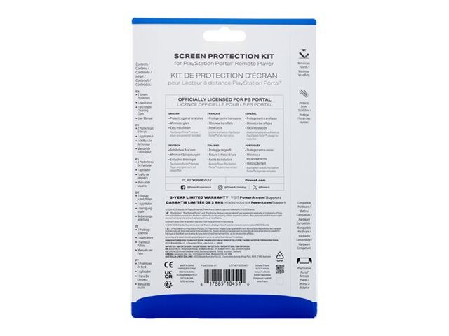 The PowerA screen protector kit offers a solution for safeguarding your Sony PlayStation 5 game controller. This kit includes two screen protectors, an applicator for installation, and a microfiber cleaning cloth to maintain a spotless finish. Designed for gaming, these protectors feature anti-glare and scratch protection, ensuring a clear surface that enhances gameplay without distractions. The film type construction provides a lightweight option that fits seamlessly with your controller, enabling a smooth user experience.