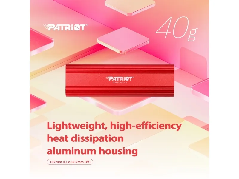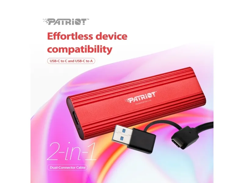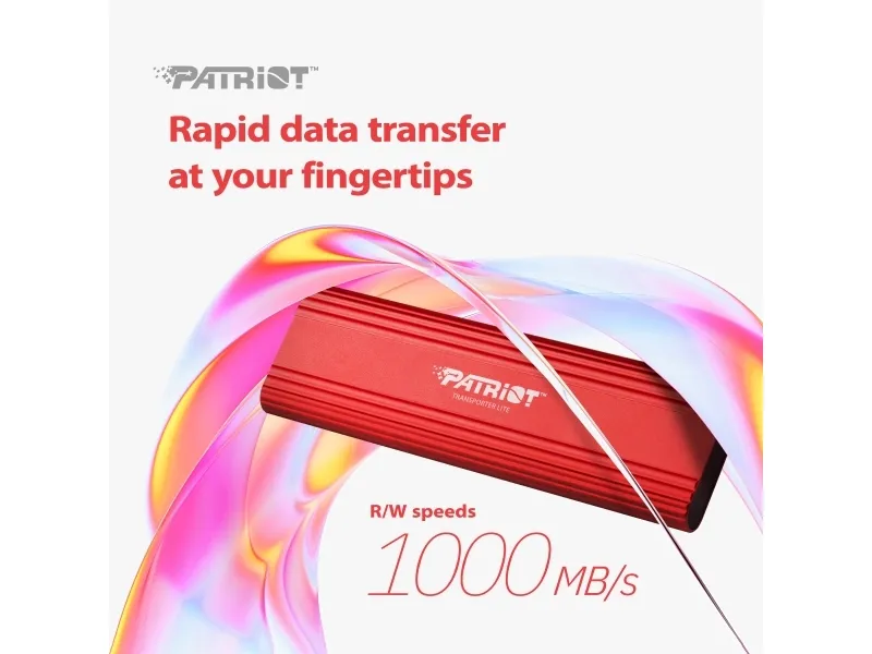 The Patriot TRANSPORTER Lite external hard drive offers performance with an internal data rate reaching 1000 MBps, suitable for transferring large files quickly. Its solid state drive ensures durability and reliability, making it a choice for users on the go. Designed with vibration resistance and a heat-spreading design, this portable drive provides protection for your valuable data while remaining compact and lightweight for easy transport. Featuring a sleek aluminum exterior, the TRANSPORTER Lite complements its design with a USB-C to USB-C or USB-A cable for versatile connectivity. This hard drive complies with standards including Plug-and-Play, BSMI, FCC, RoHS, and UKCA, ensuring it meets various operational requirements.