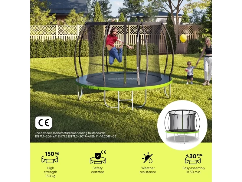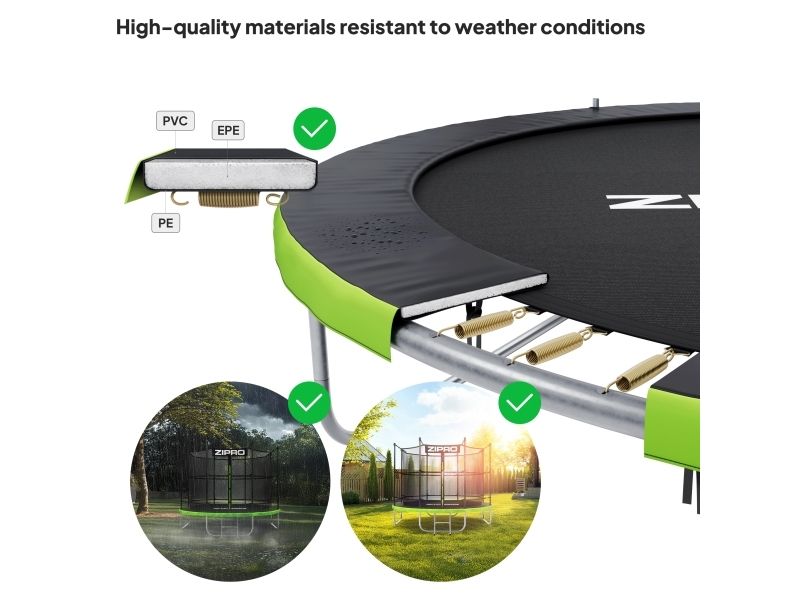 Trampolinen är väderbeständig och torkar snabbt tack vare användning av högkvalitativa material som garanterar hållbarhet.