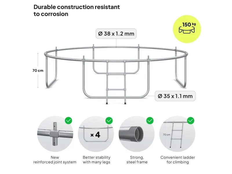 Den robusta konstruktionen av stålrör med förstärkta anslutningar ökar trampolinens hållfasthet och stabilitet.