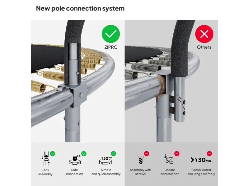 ZIPRO trampoliner använder ett förbättrat fästsystem där CROSS-SECTION-elementet förbinder ramen med benen och nätstolparna, vilket ökar hållbarheten.