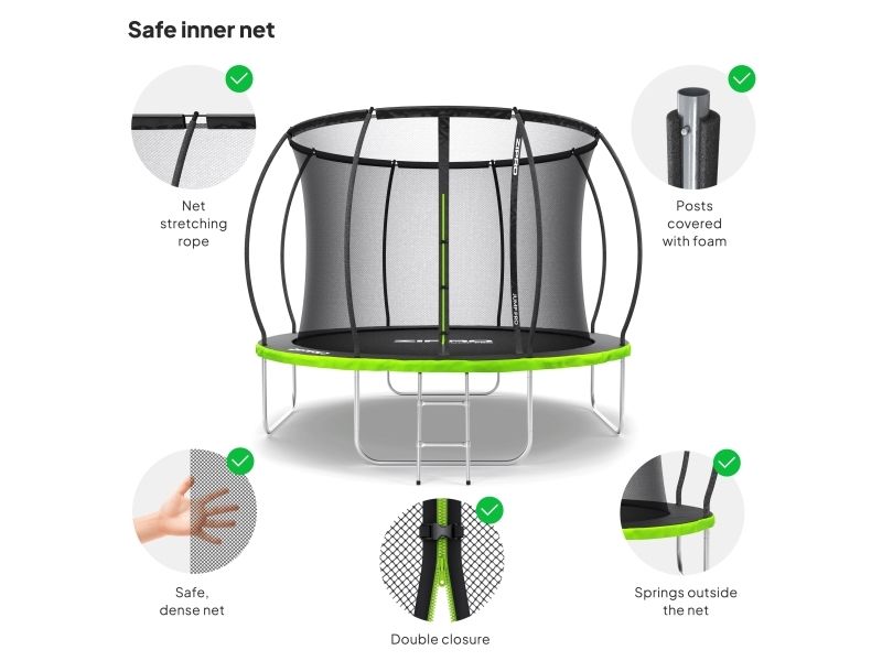 Interna nätet skiljer hopputrymmet från fjädrarna och böjda stolpar ger avstånd mellan nät och trampolinens yttre delar.