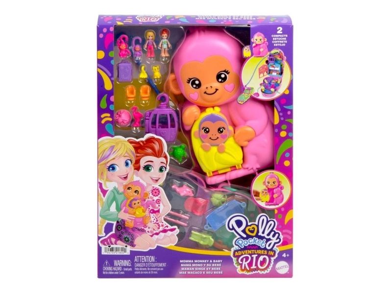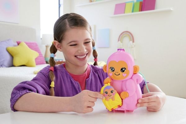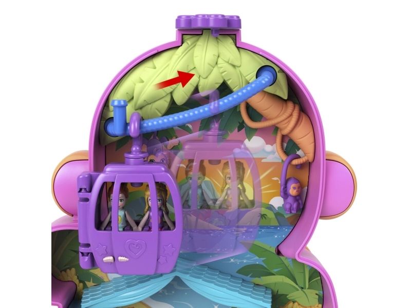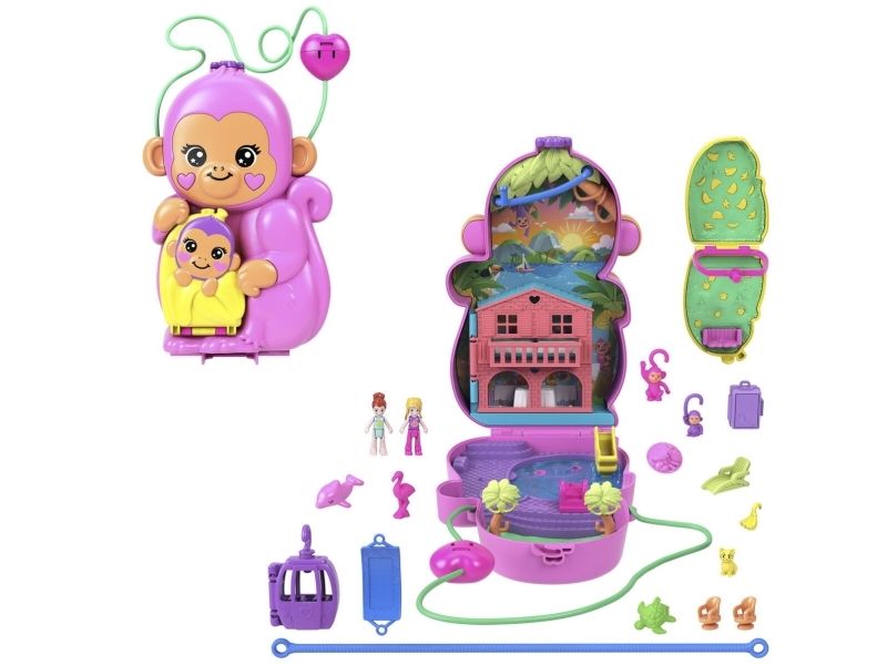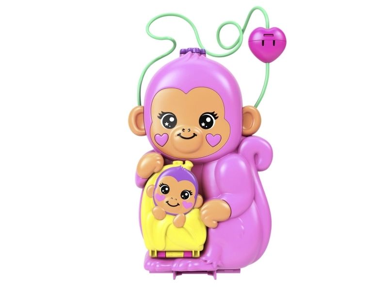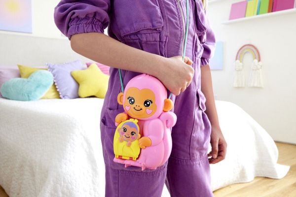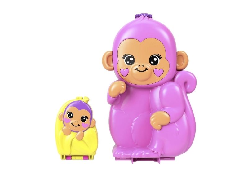 Lek med Polly Pocket-lekväskan med apmamma med unge den roliga 2-i-1-lekväskan är full av vilda äventyr! Den lilla apungen har det mysigt i mammans påse innan de ger sig ut på egna djungeläventyr. Leksetet innehåller 2 mikrodockor och 12 tillbehör, inklusive söta apor. Gunga från en lekväska till den andra i ziplinevagnen, plaska i poolen, gunga i hängmattan eller ät banansnacks i apungens djungel. Perfekt att ta med ut, packa ihop lekväskorna och bär dem i remmen. En perfekt present till barn från 4 år, särskilt de som gillar djungeläventyr med djurkompisarna! Färger och dekorationer kan variera.
