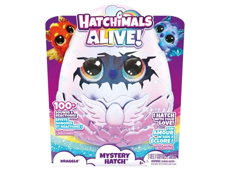 Något magiskt är på väg: Hatchimals Alive Mystery Hatch, och de behöver din kärlek för att kläckas. Med en spännande kläckningsupplevelse med dimma, ljus och över 100 ljud och reaktioner är dessa Hatchimals ett måste. Vem kommer du att kläcka? Det är en överraskning. Inuti varje Mystery Hatch Hatchimals-ägg finns 1 av 2 karaktärer. Krama, tryck, lyft och luta ägget för att uppmuntra din karaktär att kläckas - ägget kommer att lysa upp och luta och du kommer till och med att höra din Hatchimal reagera från insidan. När ditt ägg har fått tillräckligt med kärlek kan du samla familj och vänner och förbereda dig för den ultimata kläckningsupplevelsen. Magisk dimma kommer att dyka upp och ägget kommer att lysa i regnbågsfärger, vilket bygger upp spänningen. Efter kläckningen kommer din nya Mystery Hatch-vän att inspirera till fantasifulla lekar. De som älskar överraskningsleksaker, elektroniska husdjur, actionfigurer, dockor och dockhus kommer att älska Hatchimals Alive Mystery Hatch. Minnesvärda födelsedagspresenter, festpresenter eller presenter för alla tillfällen. Innehåller 4 AA-batterier. Älska din egen Hatchimal och väck den till liv med Hatchimals Alive Mystery Hatch. Från 5 år och uppåt. Batterier (4xLR6-AA) ingår.