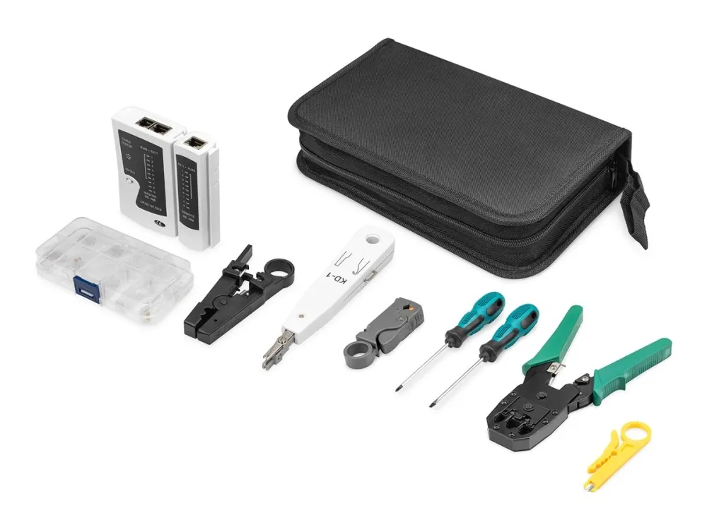 Constructed from a combination of metal, nylon, and textile, this network tools kit is designed for longevity and performance. The inclusion of modular plugs, two screwdrivers, and assembly materials enhances the kit's functionality, providing everything necessary for effective network setup and maintenance. With this toolkit, managing network tasks becomes efficient and streamlined, making it ideal for both professionals and DIY enthusiasts.