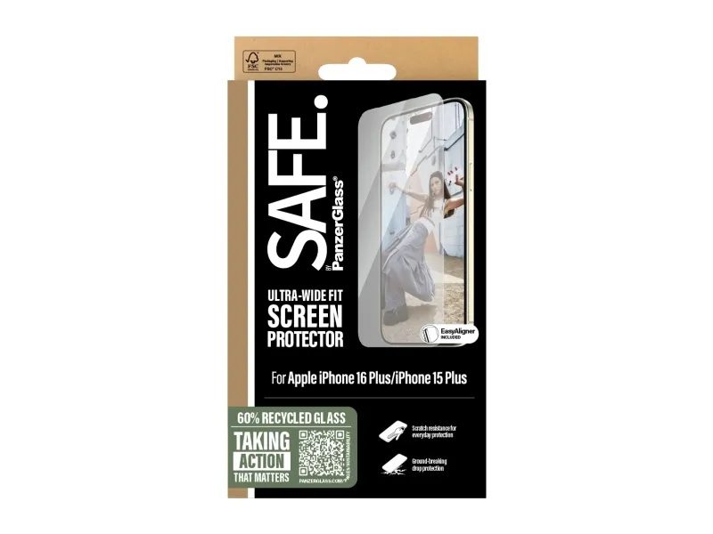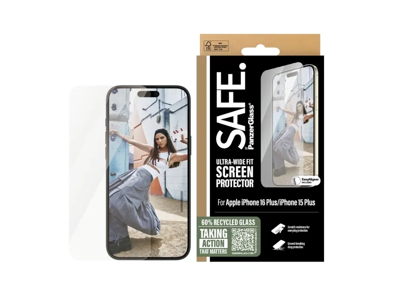 SAFE. is for real. SAFE. is for you. SAFE. is for dance floor mishaps, selfies gone wrong and your everyday fumbling, dropping and screen cracking. This SAFE. by PanzerGlass ? screen protector made of 60% recycled material acts as a discrete airbag, protecting your phone by absorbing impacts and providing high-level scratch resistance without compromising the functionality and look of your device. It even has a smudge-free coating that reduces traces of fingerprints and grease.Can you feel it? Love is in the air. Love for phones and the planet. It's the new circle of phone life. When you keep your beloved phone SAFE., you can one day pass it on to another phone lover who will love it just as much as you do. Choose SAFE. and give your phone a second, third or fourth life! This is one way of working toward a more sustainable future! Another is to use less and less and LESS packaging: For this screen protector, we've reduced the paper packaging by 33%*. This product comes in a recyclable FSC-certified box.Everybody deserves to be SAFE. Without hassle, red tape, or unnecessary complexity. This screen protector comes with an EasyAligner that makes installation a piece of cake (seriously!) and to make it even easier, we've included step-by-step instructions as well as a QR code for quick access to our online how-to video. And remember: You just need to install the screen protection once! Then you'll never again fear the sight of your phone tumbling to the ground screen first. This may not happen, but if it does, you'll regret not having clicked "add to cart".No screen protection is worth poor screen performance! That's why this screen protector comes in Ultra-Wide Fit, meaning it covers the front surface of your phone, providing a complete and crystal-clear view of your screen. It even leaves a little room around the edges to give you the freedom to upgrade your protection with a SAFE. by PanzerGlassTM case. And if you want 360-degree protection, combine the screen protector and case with a SAFE. by PanzerGlass camera lens protector.Keep your phone SAFE.*Measured by third-party lab by comparing the mass of the new paper packaging introduced in 2023 with the mass of the previous paper packaging introduced in 2022 (CPRTC, report No. ZSA20231301-0016).