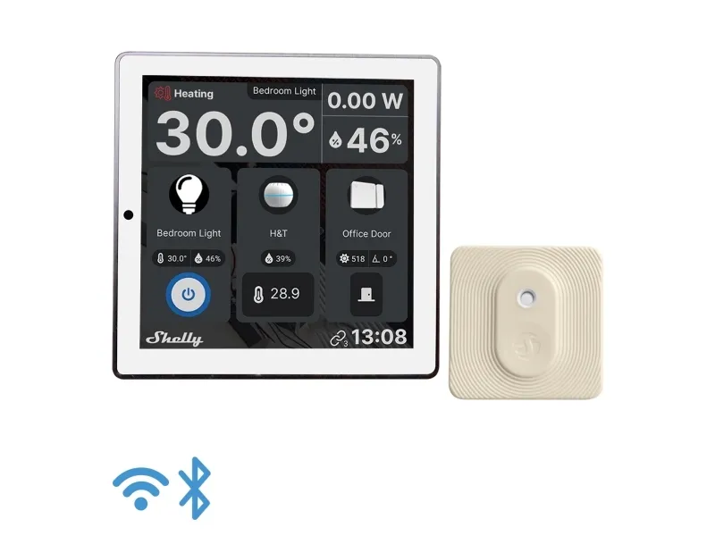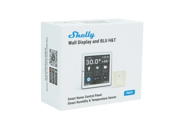 Shelly Wall Display is a 4” Android-based touch screen that provides easy control of your home or office. With a minimalist design, sleek user interface, and customizable home screen, Shelly Wall Display will not only fit perfectly into your interior but can also be adapted to the room’s needs. In this bundle, a Shelly BLU H&T temperature and humidity sensor is included, which can report a more accurate room temperature to the Shelly Wall Display. On the device’s home screen, you get a quick overview of your favorite devices and scenes. You can also use Shelly Wall Display to control your Bluetooth and Sonos speakers. Wall Display has a thermostat function and can be used to regulate the room temperature. The device also shows the current power consumption, room temperature, and humidity. Like all other Shelly devices, Shelly Wall Display integrates perfectly with more than 200 partner systems such as Home Assistant, Homey, SmartThings, Google, Alexa, and many more. It is also possible to add virtual devices to the screen, which can be used to activate third-party devices through webhook calls in Home Assistant or similar. Function Shelly Wall Display is installed in European wall boxes. It is recommended that the screen be installed at a height that is comfortable to look at and operate. Wall Display has a built-in 5A relay, which can be used to control lights, underfloor heating, or other devices. The device also has a built-in temperature sensor, humidity sensor, lux sensor, and thermostat function. Connection Shelly Wall Display can connect to the internet or the local network on 2.4 GHz WiFi. Additionally, the device has built-in Bluetooth like the rest of the Pro and Plus devices, so it can also be used as a gateway for Shelly Bluetooth devices. Shelly Wall Display works locally without connection to Shelly Cloud, but it is recommended to activate it for easy data storage and increased functionality. The device can also communicate via MQTT, HTTP, and WebSocket. Hardware The device is equipped with generation 2 hardware, which includes a powerful ESP32 processor. Additionally, it is equipped with extra safety features such as over-temperature, over-voltage, over-current, and overload protection. The new hardware also allows for scripting functions for advanced and customized functionality as well as a range extender function with the device.