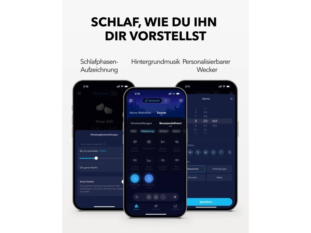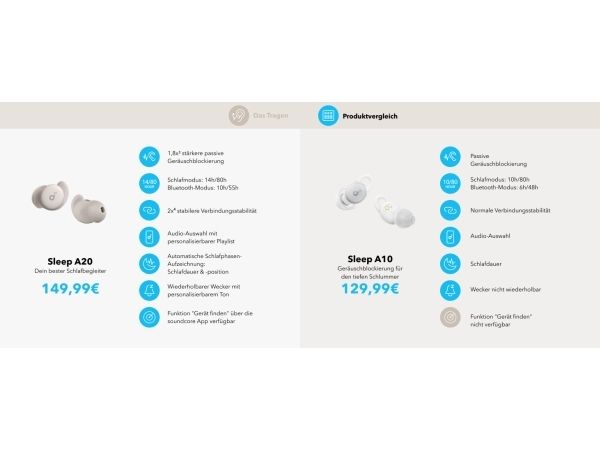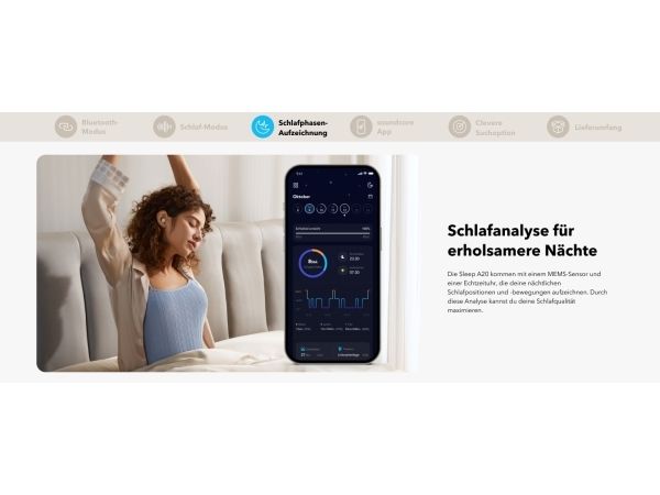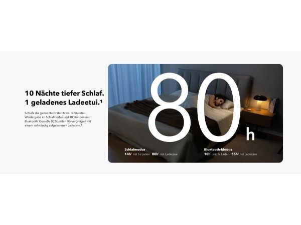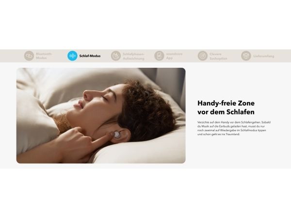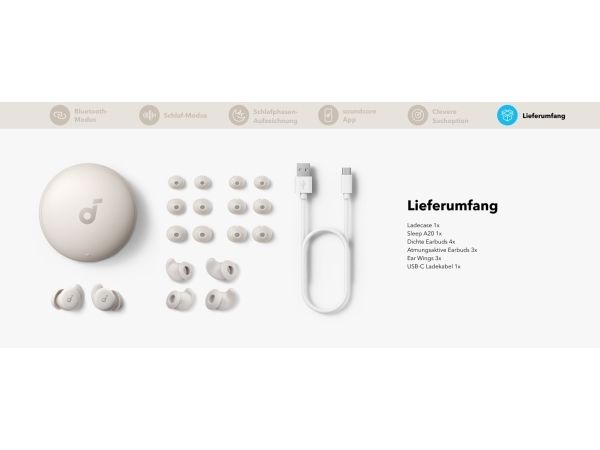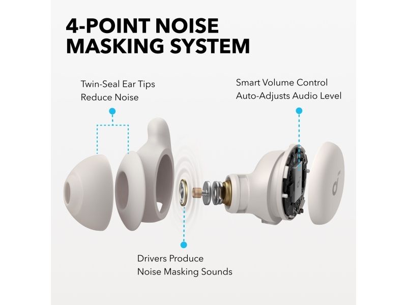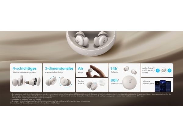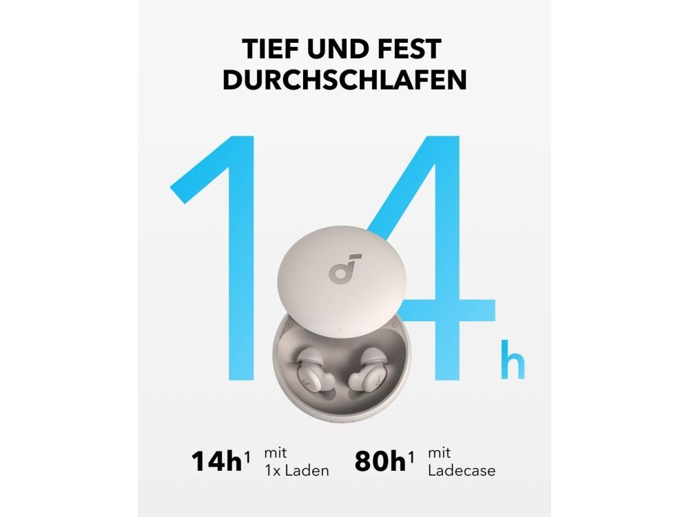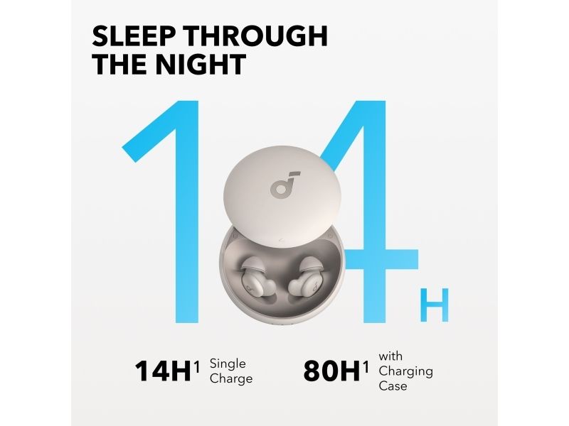 Get a better night's rest with the Soundcore Sleep A20 earbuds. Designed with ultra-soft materials and a 3D ergonomic shape, they are incredibly comfortable, even for side sleepers. The 4-point noise masking system helps block out unwanted noise, so you can sleep soundly. You get up to 14 hours of battery life in Sleep mode and an extra 80 hours with the charging case, giving you around 10 nights before you need to recharge.Soundcore Sleep A20. Product type: Headset. Connectivity technology: Wireless, Bluetooth. Recommended usage: Calls/Music/Sport/Everyday. Headphone frequency: 20 - 20000 Hz. Wireless range: 10 m. Weight: 53 g. Product colour: White