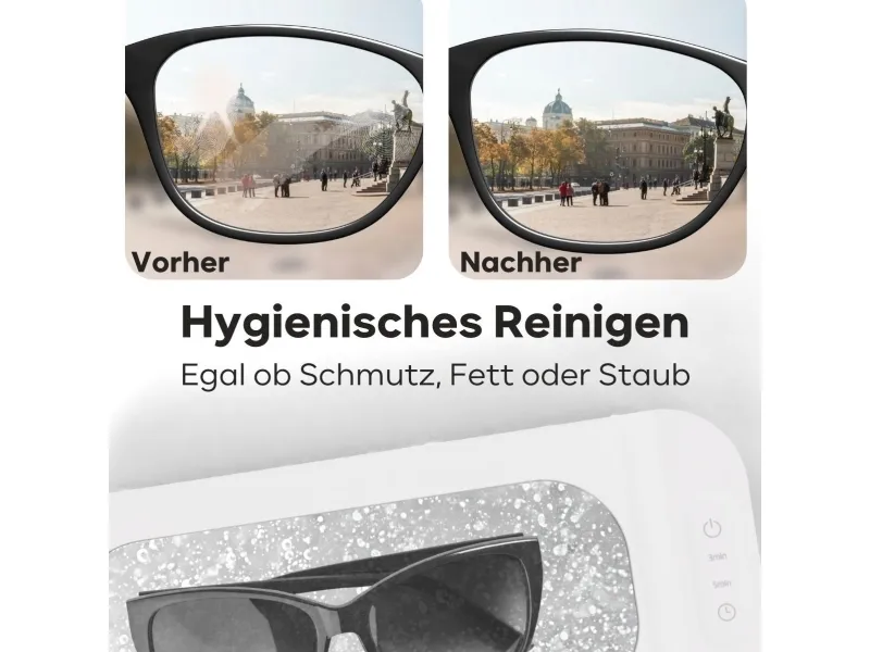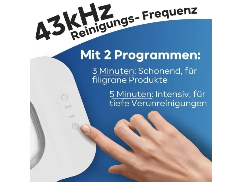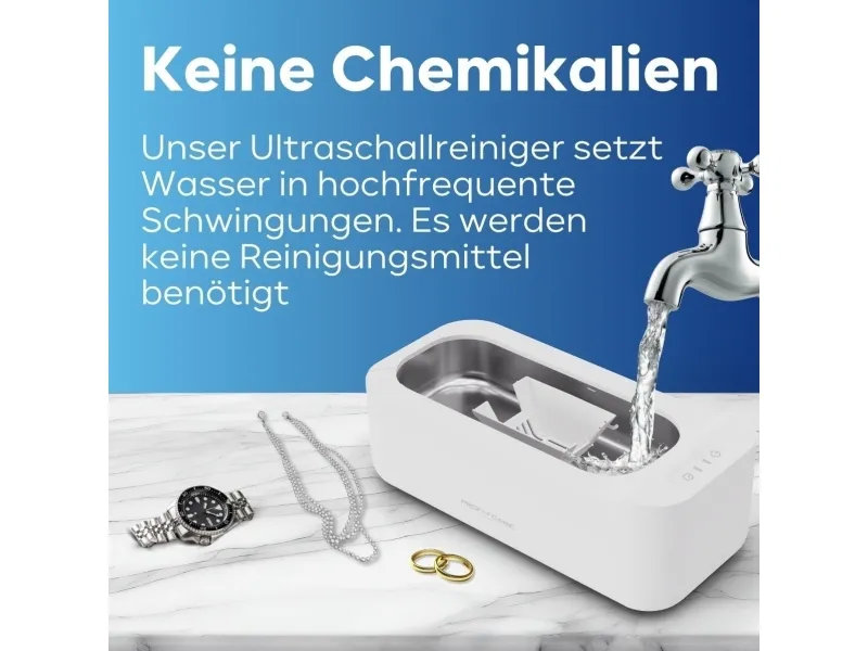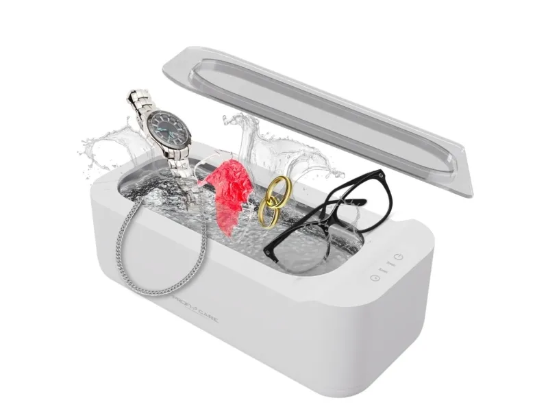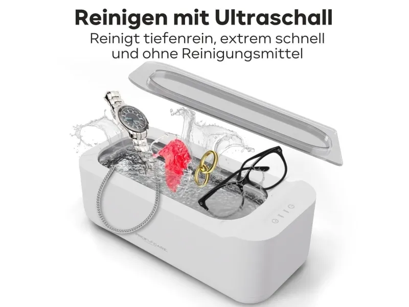The ProfiCare Ultrasonic Cleaner PC-USR 3120 in elegant white is the perfect solution for hygienic cleaning of watches, jewelry, eyeglasses, dental prostheses, and braces. With a 2-stage timer, you can choose between a gentle 3-minute cleaning and an intensive 5-minute cleaning. The hygienic stainless steel cleaning container is easy to clean, and the material-friendly cleaning process is chemical-free. Thanks to the high cleaning frequency of 43 kHz, even the smallest dirt particles in hard-to-reach places are removed. The sensor touch control, multifunctional insert basket, and transparent lid make operation easy and convenient. With a capacity of 400 ml, 2 indicator lights, and a detachable power cord for space-saving storage, this device is extremely practical. The integrated pour spout and non-slip feet ensure safety and stability.ProfiCare PC-USR 3120. AC input voltage: 100-240 V, AC input frequency: 50/60 Hz
