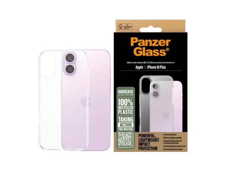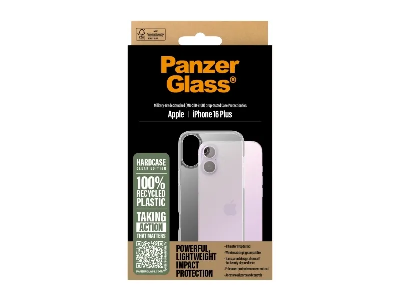 Want more impact protection with less impact on the planet? This PanzerGlass HardCase has a back cover made of 100% recycled plastic and keeps your phone safe from drops, shocks, scratches and most of whatever else life might throw at you. The case has even been drop-tested according to 4 x Military Grade Standard, which means it can withstand several drops from a height of 4.8 metres or a sitting-on-a-balcony-and-accidently-dropping-your-phone kind of height.? The HardCase protects and prolongs the lifetime of your phone so that one day you can pass it on to someone else who will love it just as much as you do. This is one way to work towards a more sustainable future. Another is to use less packaging: In 2024, we reduced the amount of paper in our PanzerGlass core product packaging design by an average of 66 %*. The wireless charging compatible HardCase features a stiff, transparent back cover surrounded by a softer frame. Both back cover and frame are anti-yellowing so your case will continue to look great day after day, even with heavy use. For extra protection, combine the case with a PanzerGlass screen protector and a PanzerGlass PicturePerfect or HoopsTM camera lens protector.? *Reduction from 2022-2024 measured by comparing selected products from the PanzerGlass core range.