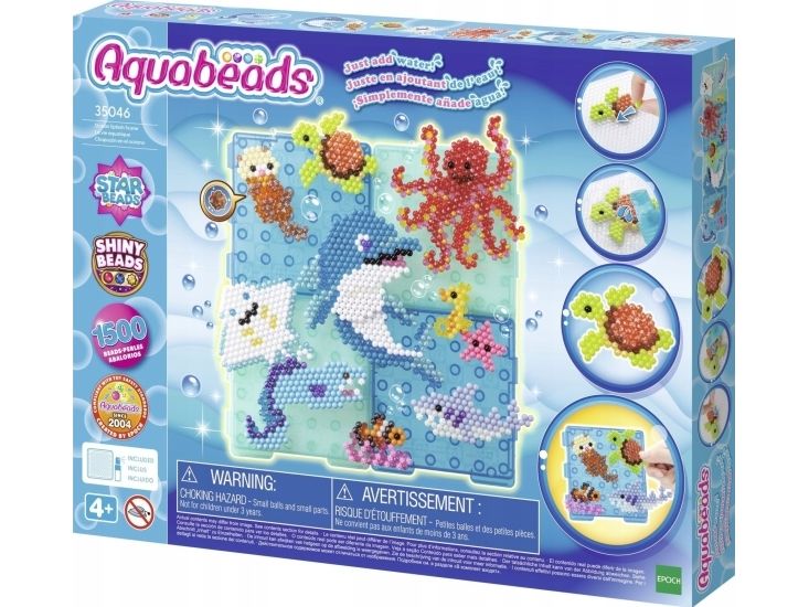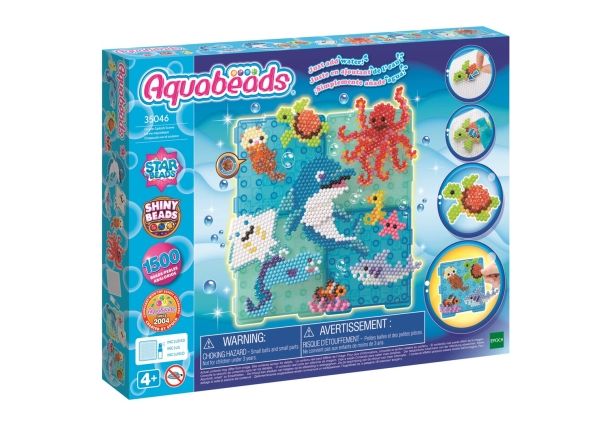 Aquabeads är den ursprungliga pysselserien för vattenpärlor! Sedan 2004 har barn runt om i världen skapat miljontals Aquabeads-skapelser. Ocean splask setet innehåller över 1500 matta-, juvel- och stjärnpärlor samt kantika och lysande pärlor i 29 färger, en bricka, spruta, platta, tappar, mallar och instruktioner. Placera pärlorna ovanpå mallarket på brickan. De lysande pärlorna ger glans och gnista till dina skapelser. Spraya vatten över pärlorna så fastnar de magiskt ihop! När skapelsen har torkat efter 60 minuter, ta försiktigt bort den från brickan och placera den på en platta med tappar. Lämplig för barn över 4 år.