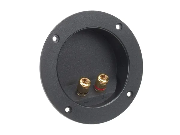 This round loudspeaker terminal for plug-in connection 2-poles has gilded connections a diameter of 105 mm and needs a drilling circle diameter of 76 mm.