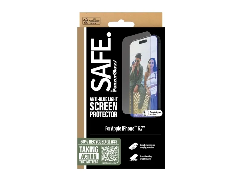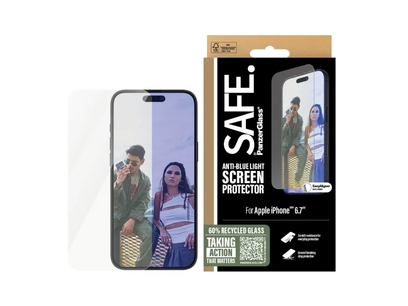 Protect your phone as well as your eyes with this Anti-blue light screen protector from SAFE. by PanzerGlass . A true game changer for gamers and other screen lovers, this screen protector made of 60% recycled glass reduces the strong blue light from your phone that can cause eye strain, headache and fatigue. And the screen protection? Well, let's put it this way: You no longer need to worry about scratch-creating bumps, crushing falls, and other hazards of everyday life. The screen protector even has a smudge-free coating that reduces traces of fingerprints and grease.  Can you feel it? Love is in the air. Love for phones and the planet. It's the new circle of phone life. When you keep your beloved phone SAFE., you can one day pass it on to another phone lover who will adore it just as much as you do. Choose SAFE. and give your phone new life! This is one way of working toward a more sustainable future! Another is to use more sustainable packaging. So, of course, this product comes in a recyclable FSC-certified box. Everybody deserves to be SAFE. Without hassle, red tape, or unnecessary complexity. This screen protector comes with an EasyAligner made of 100% recycled plastic that makes installation a piece of cake (seriously!). We've even included step-by-step instructions as well as a QR code for quick access to our online how-to video. And remember: Once installed, you'll never again fear your phone falling screen-first. So, what are you waiting for? No screen protection is worth poor screen performance! That's why this screen protector has an Ultra-Wide Fit, meaning it covers the front surface of your phone, providing a complete and crystal-clear view of your screen. It even leaves a little room around the edges for a SAFE. by PanzerGlass case or a cool, colorful case from CARE by PanzerGlass . And if you want to be extra SAFE., combine the screen protector and case with a SAFE. by PanzerGlass camera lens protector. Keep your phone SAFE.