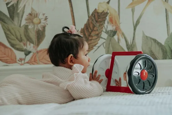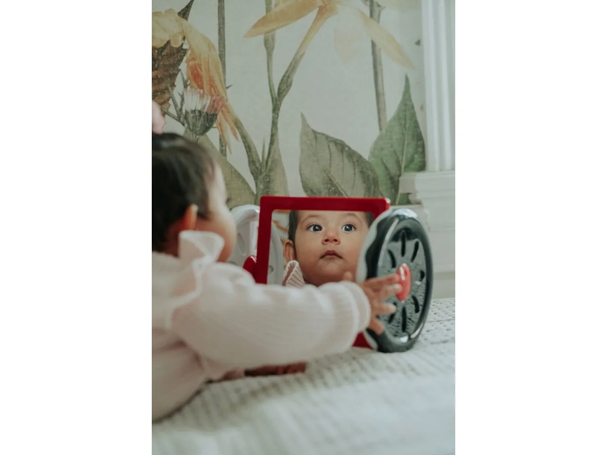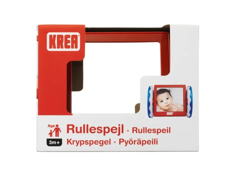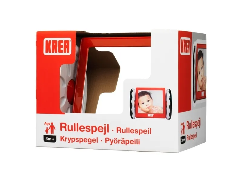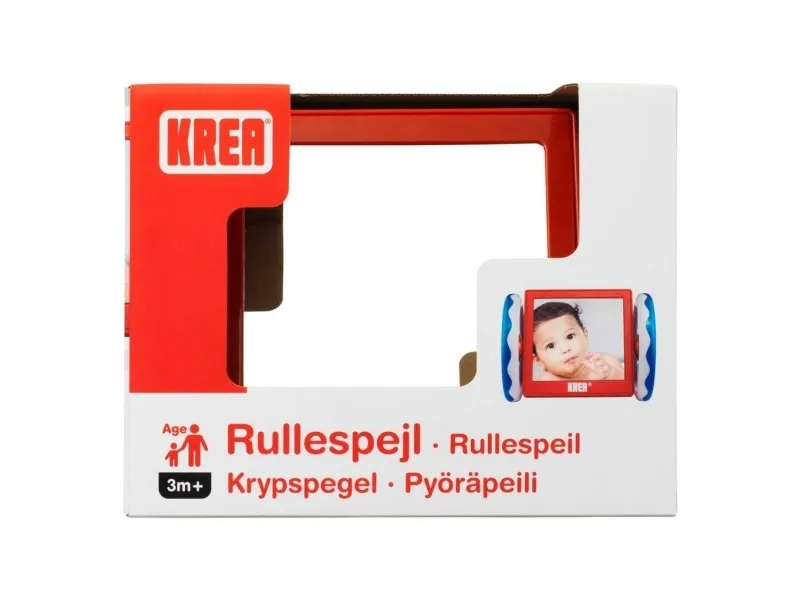 Aktivitetsspegel för barn som kan rullas på golvet. Lek ofta med barnet och se hur barnet fascineras av att se sig själv i spegeln. Låt spegeln rulla på golvet och låt barnet försöka följa. Det är krävande för barnet och stärker nack- och magmusklerna. Babyleksaker måste ha en funktion som gynnar ditt barns utveckling, och med babyspegeln från KREA stärks flera av barnets motoriska förmågor. DIMENSIONER: 22 x 17 x 16,5 cm. Från 3 månader.
