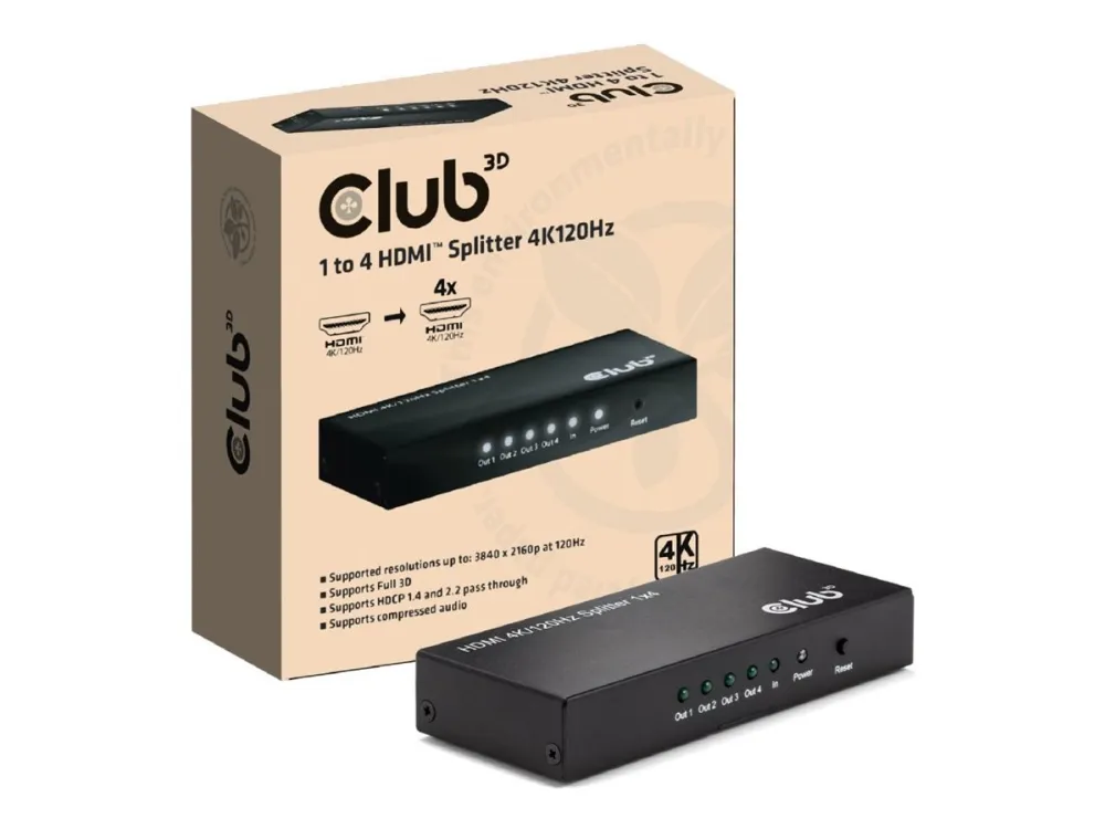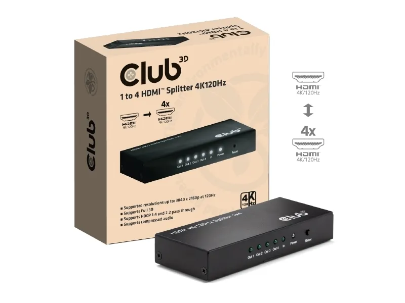 CLUB3D 1 to 4 HDMI™ Splitter 4K120Hz. Video port type: HDMI, Video out: 4x HDMI. Maximum resolution: 3840 x 2160 pixels, Product colour: Black, HD type: 4K Ultra HD. Quantity per pack: 1 pc(s), Package type: Box, Paper/cardboard packaging weight: 62 g. Harmonized System (HS) code: 8473 3020