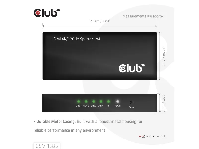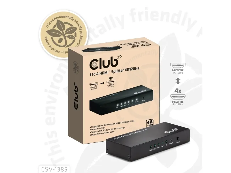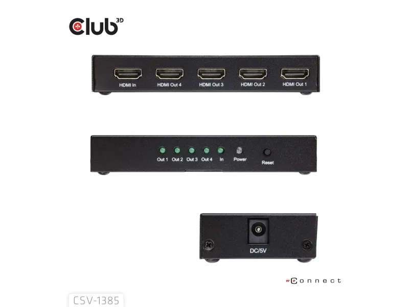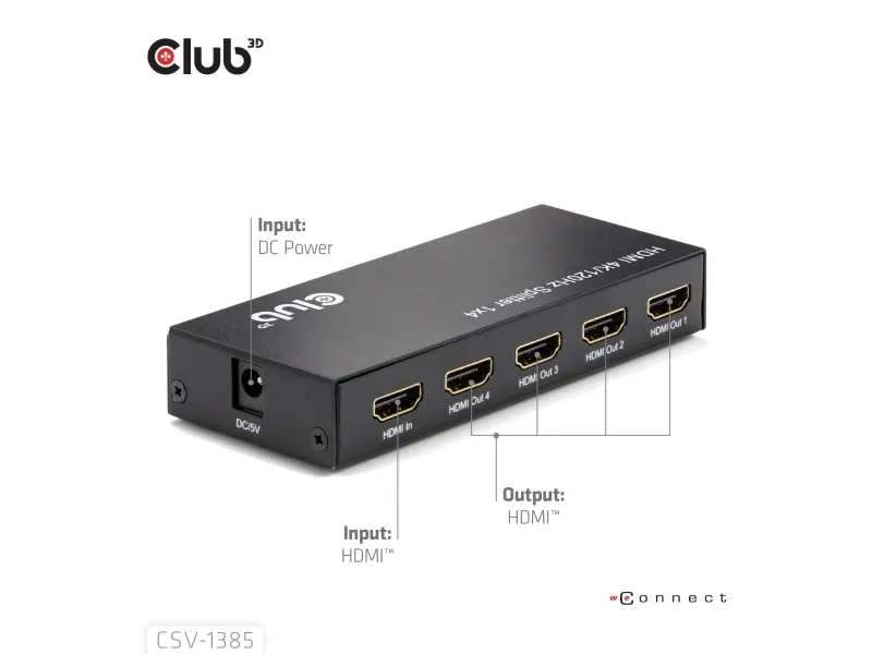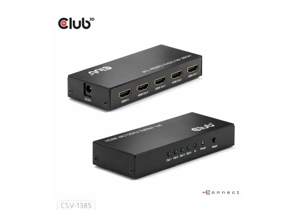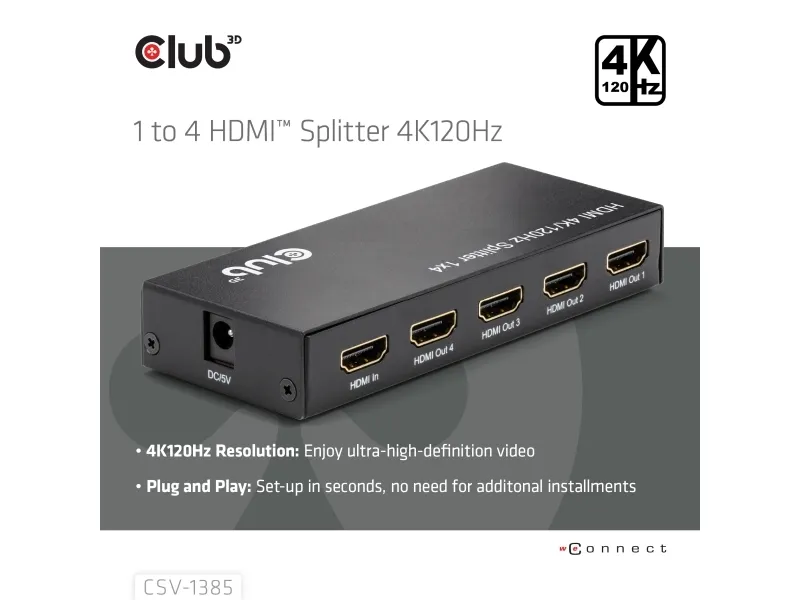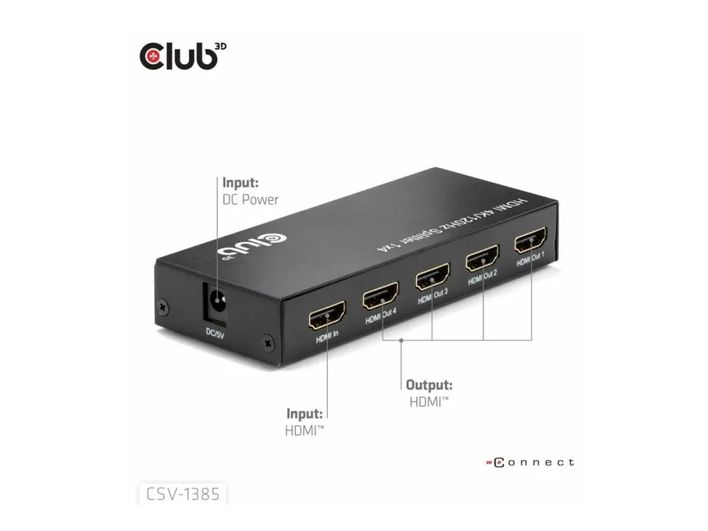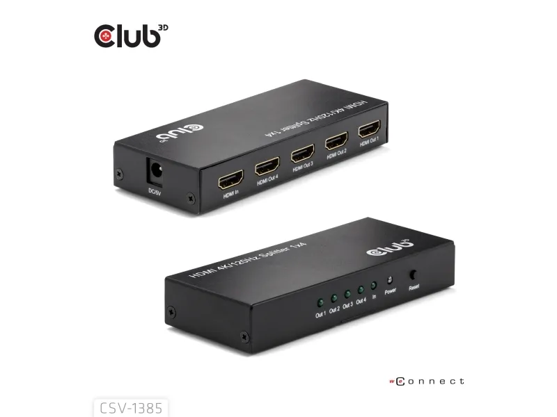 The Club 3D CSV-1385 is a high-performance and small-sized 1 to 4 HDMI™ Splitter 4K120Hz with hot plug and iron casing. It distributes the input of the HDMI™ signal into four identical outputs at the same time. It provides high performance audio and video output through HDMI™ cables up to 4K@120Hz resolution. This Splitter only splits the input signal to 4 output ports based on the input signals specifications.