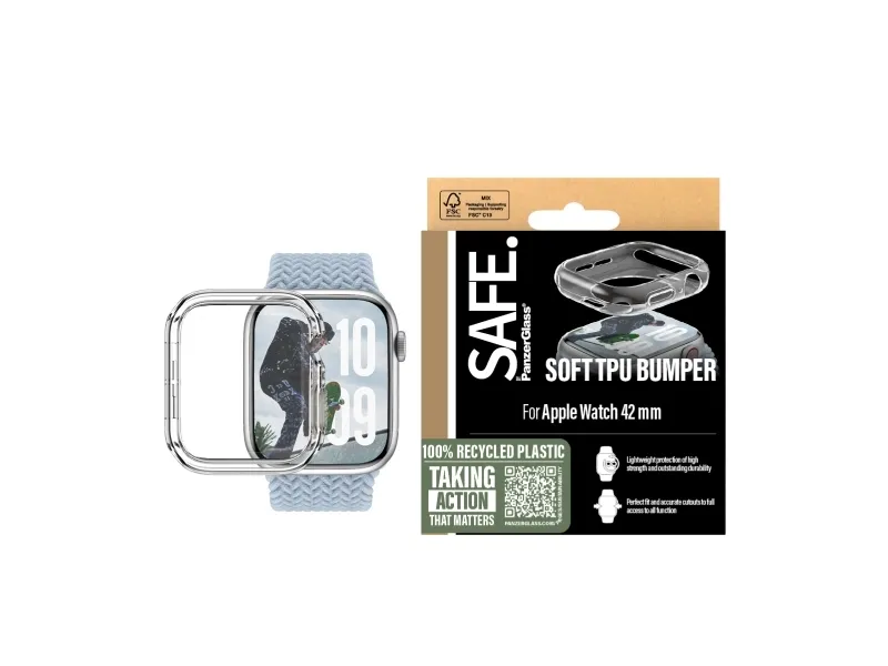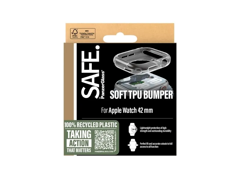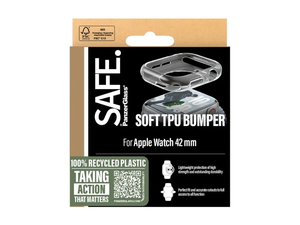 Whether you bang your brand-new watch against the ground doing push-ups or accidently bump it against a sharp-edged coffee table corner while chilling on the couch, this bumper from SAFE. by PanzerGlass ? has your back. This transparent bumper without glass from SAFE. by PanzerGlass protects your watch from scratches and drops, while providing easy access to all functions. You don't even need to take it off when charging your watch! It's max style and max protection! Made of soft, lightweight TPU material that attaches seamlessly with accurate cutouts for a perfect fit. SAFE. is pure love for devices and the planet! When you keep your watch SAFE., you can one day pass it on to another watch lover! It's the new circle of phone life and one way of working toward a more sustainable future! Another is to use more sustainable packaging and that's why we deliver this product in a recyclable FSC-certified box. Keep your watch SAFE.