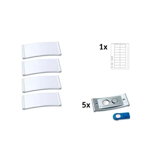 Navneskilt Badgepoint® 70x30 mm, Polar® Classic 30 Medarbejderskiltesæt, skilte med rustfri stålramme, akrylglas og printbare indstik - 5 skilte inkl. 18 indstik