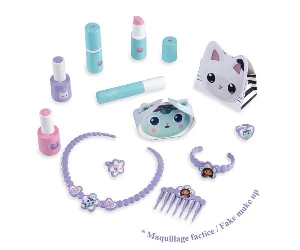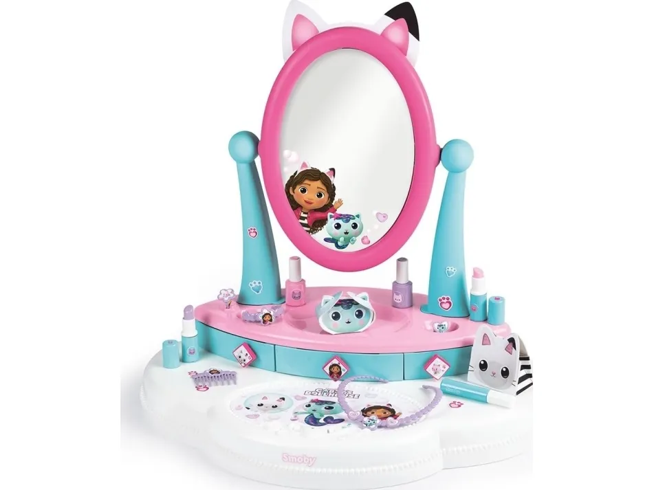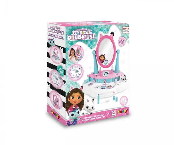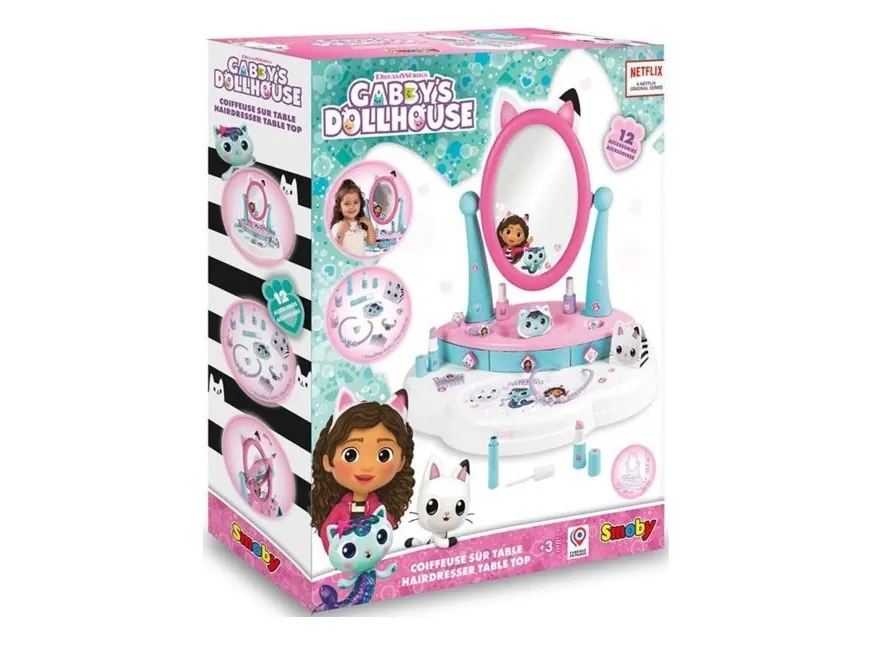 The Smoby Gabby's Dollhouse hairdressing table set uniquely combines the three most popular play themes relating to beauty and care: hairstyling, nail care and make-up. Even the little ones can experience magical Gabby moments here and let off steam creatively as a make-up artist or hair stylist or pamper themselves. The compact dressing table attachment features the original Dreamworks Gabby's Dollhouse design and offers lots of realistically designed accessories with great motifs from the series stars.