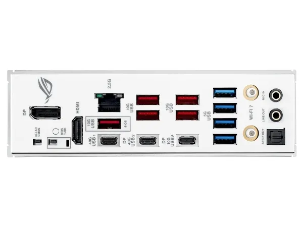 2 x antenn 1 x HDMI 1 x LAN (2.5Gigabit Ethernet) 2 x USB4 5 x USB-C 3.2 Gen 2 1 x USB 3.2 Gen 2 4 x USB 3.2 Gen 1 1 x SPDIF-utgång 1 x mikrofon - mini-jack 1 x ljudutgång - mini-jack