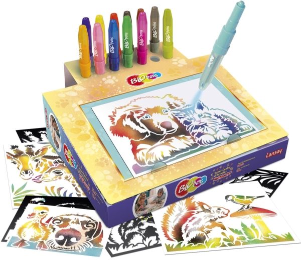 Blopens super aktivitetsverkstad med djur. Med Blopens blåspennor och stenciler kan du skapa vackra målningar och konstverk med de sötaste djurmotiven. Från 7+ år