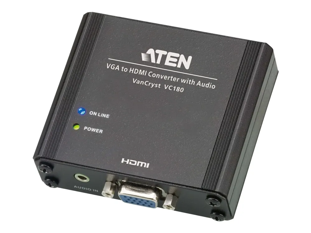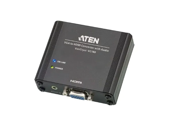 The VC180 is a VGA-to-HDMI converter with audio that lets you view VGA source data in an HDMI output display with stereo sound quality. It uses dual power sources - from the VGA port or a power adapter. The VC180 gets its power supply from the VGA port. However if your source device is not capable of supplying power, use the power adapter to connect the VC180 to a power source. The VC180 is compact, flexible and convenient to install - with no software required. Simply make the hardware connections and enjoy the experience.